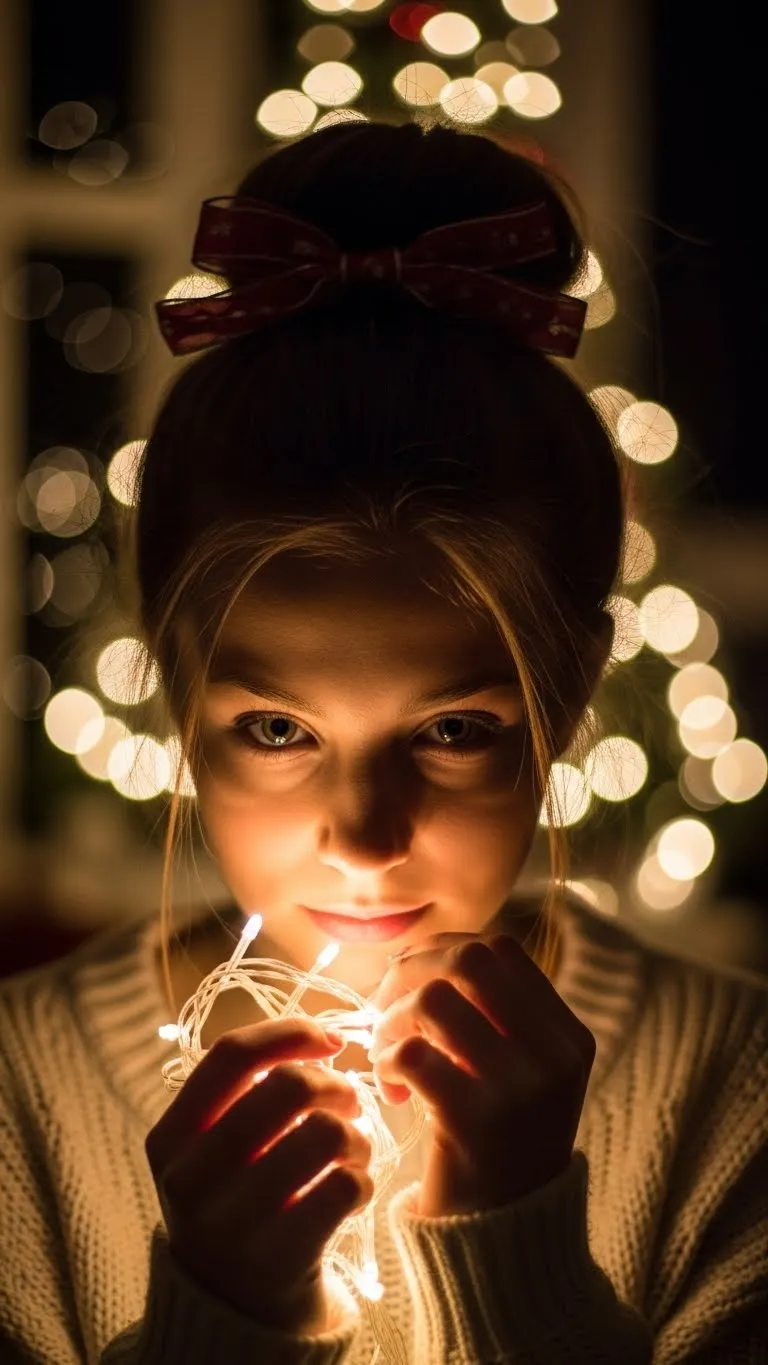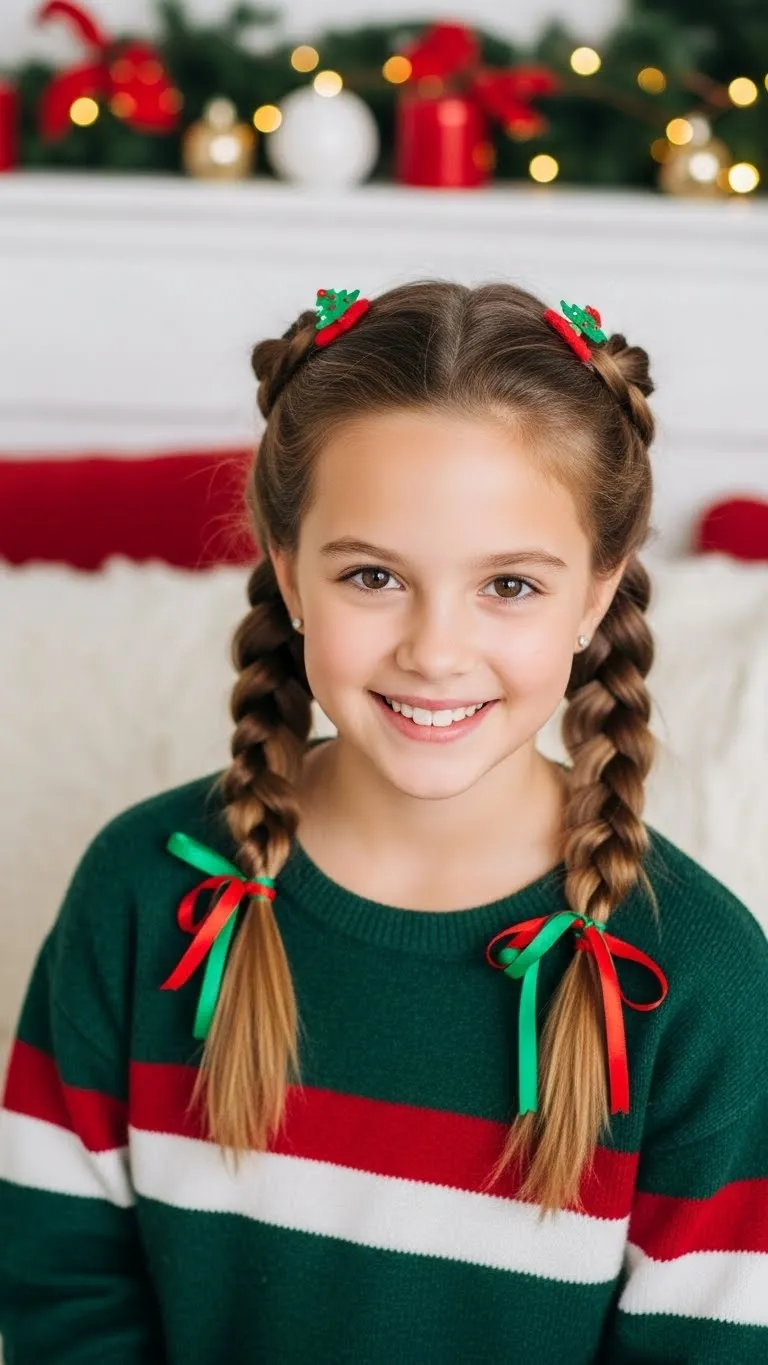 [Image Prompt: A high-end photo of a cheerful girl with festive Christmas-themed hairstyles, soft natural lighting, warm holiday décor in the background, crisp details in the hair texture, no text in the image.]