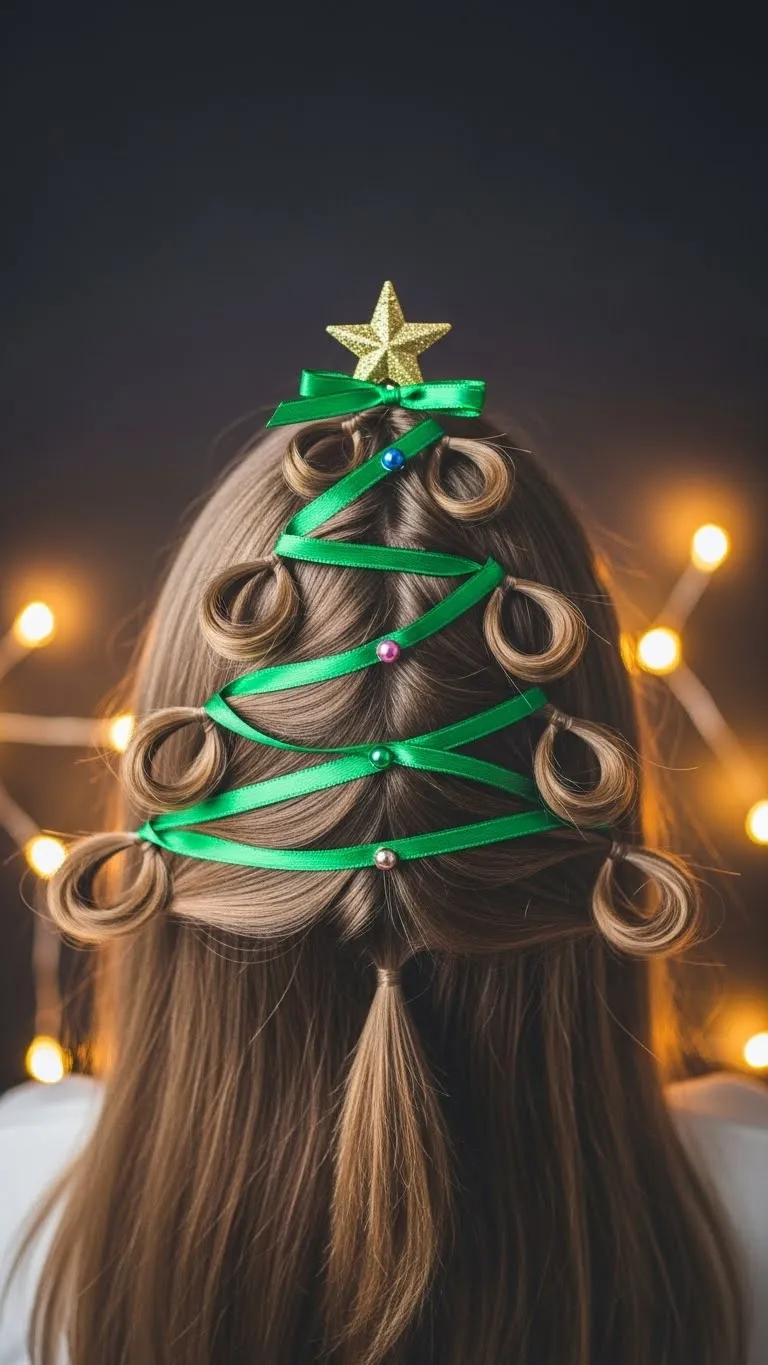 This twisted style forms a triangle-shaped tree. Part the hair into several vertical sections. Twist each one and secure them downward so they fan out into a tree shape. Wrap thin green ribbon across like garland. Add two or three tiny bead “ornaments.” The result looks adorable without being overly detailed. Use soft ribbons so they curve naturally. This style works best on medium or long hair. It photographs beautifully and feels light enough for all-day wear.