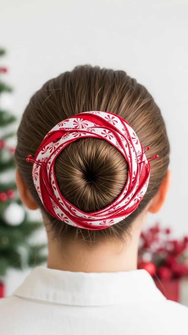 A low bun wrapped in peppermint-colored ribbon adds a festive touch with minimal effort. Start with a neat low bun. Wrap red-and-white ribbon around it in a swirl pattern. Leave some space so the colors show. Use one or two pins to secure. This style looks lovely for holiday dinners or church events. You can replace the ribbon with leftover gift trim. If the bun needs more volume, gently pull on sections to widen it. It’s comfortable and easy to recreate.