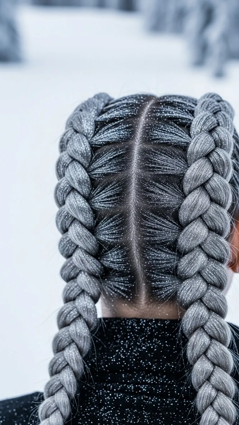 These pigtails look wintery with a soft silver “frosted” effect. Braid two pigtails and lightly mist glitter spray near the ends. Use only a small amount so it doesn’t feel stiff. This style looks pretty for outdoor photos or holiday card pictures. To save money, choose a small travel-size glitter spray. It washes out easily with shampoo. This style also works for curly hair. Just braid loosely to keep texture intact.