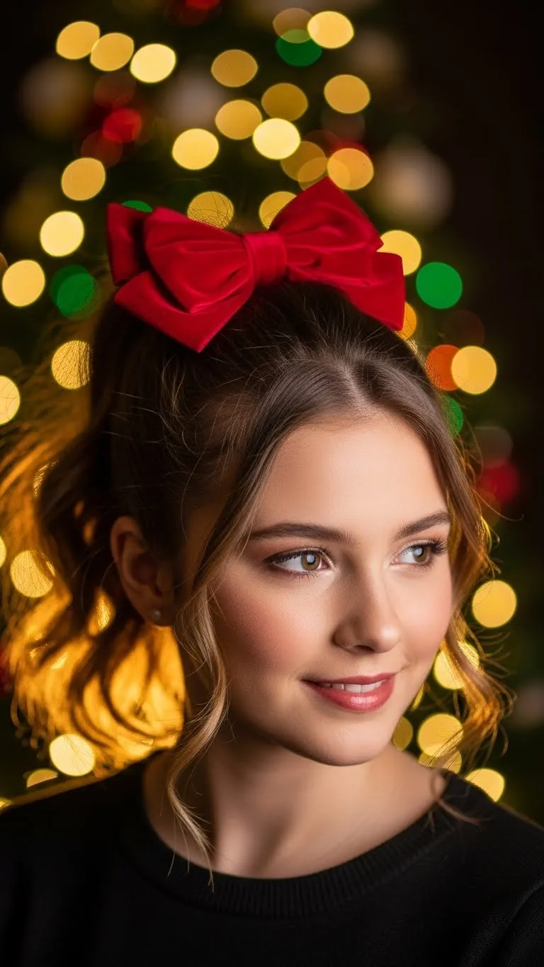 This half pony feels soft and festive with one large velvet bow. Gather the top half of the hair and secure with a soft elastic. Clip or tie the velvet bow on top. This accessory stands out without much styling needed. Velvet bows are easy to find at discount shops. The style works well for wavy or straight hair. You can gently curl the ends for extra polish. It’s comfortable enough for all-day wear.