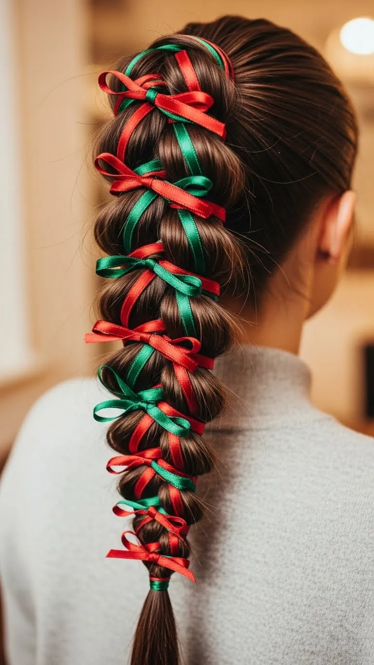 Start with a low or mid ponytail, braid it, and wrap a thin ribbon around it in a spiral. Pick green or red ribbon for a Christmas feel. Leave small gaps to show the braid underneath. This idea looks intricate but is quick. For a cheaper option, use yarn. You can match ribbon color to her outfit. This style stays secure for active events and adds charm to simple holiday looks.