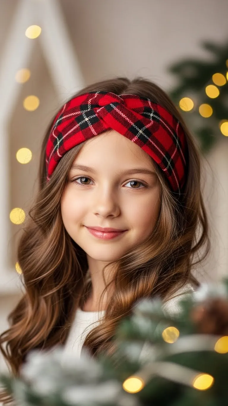 A plaid headband adds holiday personality without much styling. Brush the hair down and let it fall naturally. Place the headband just behind the hairline. Choose soft fabric so it stays comfortable. Plaid patterns come in many colors, and you can pick one that matches her outfit. This style works for short, medium, or long hair. It’s great for busy mornings when you want something festive with minimal effort.