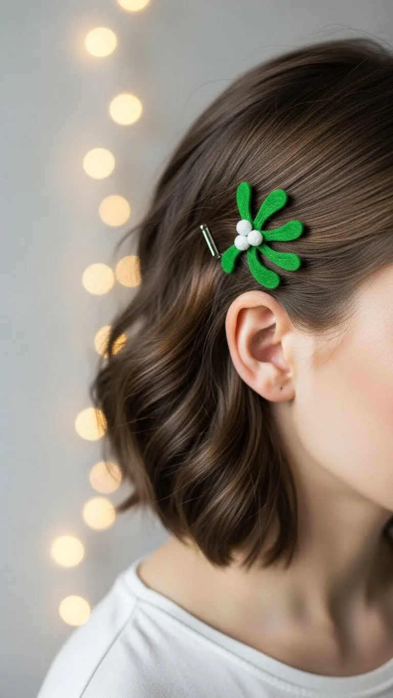 Create a deep side part and tuck one side behind the ear. Add a small mistletoe clip right above the ear. Choose soft, felt versions so they don’t poke. These clips cost very little and often come in sets. The style works for both short and long hair. It gives a gentle Christmas feel without being flashy. You can also add a few loose curls at the ends if she wants extra texture.