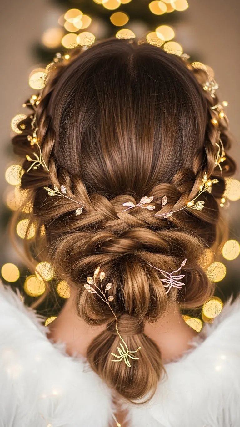A braided crown gives a soft, holiday feel without needing advanced braiding skills. Part the hair down the middle and braid two long sections. Pull each braid around the head and pin. Then place a couple of tiny faux holly berries along one side. Choose small pieces so the style stays comfortable. This look is cute for school concerts or family gatherings. You can buy inexpensive holly decorations at craft stores and snip off small berry clusters. If you’re worried about slipping, add a bit of hairspray before pinning. The style stays secure even for active kids. This crown works well for both straight and curly hair. Leave a few strands out near the ears for a soft, cozy effect. It’s a warm holiday hairstyle without being overly decorated.