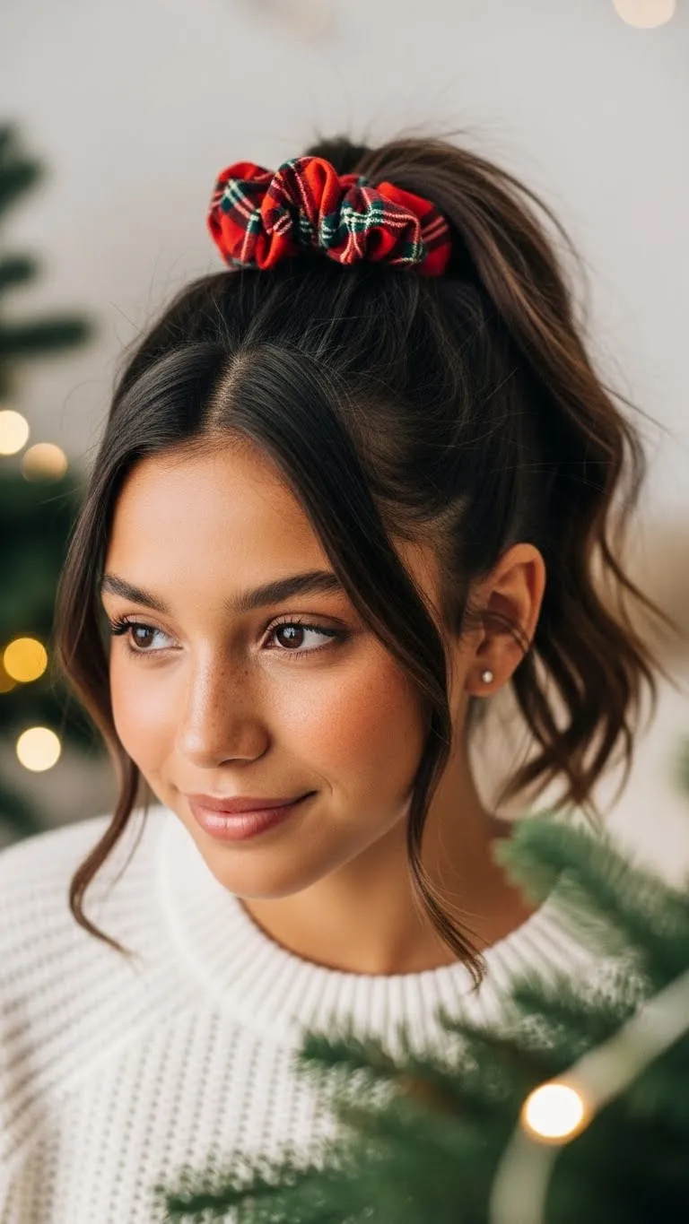 A plaid scrunchie can turn an everyday ponytail into a sweet holiday look. Choose a soft cotton or velvet scrunchie for comfort. Gather the hair into a mid pony and secure. This works well for any hair texture and all ages. Scrunchies are cheap, easy to match with outfits, and gentle on the hair. Add a few small waves to the ponytail if wanted. It’s fast, festive, and great for busy mornings.