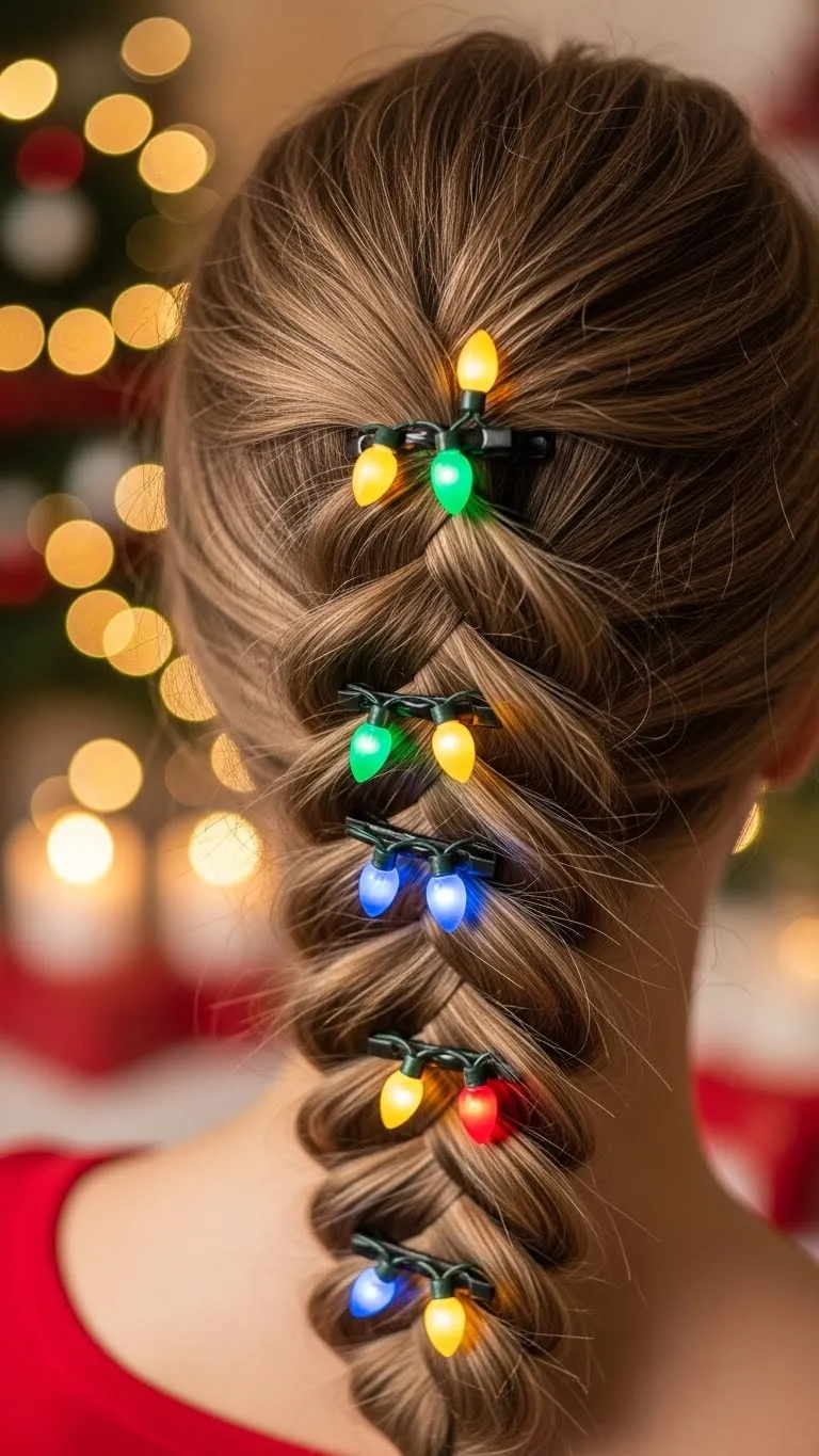 This braid uses tiny, lightweight charms shaped like lights. They clip along the braid without pulling the hair. Start with a basic three-strand braid and space the charms evenly. The result looks festive without being heavy. Many charms come in kid-friendly plastic, making them safe and comfortable. If you’re on a budget, look for craft beads shaped like bulbs and attach them to hairpins. This style works well for long hair. It’s quick and holds well for active kids. The colorful lights brighten up simple outfits and make the braid stand out in photos.