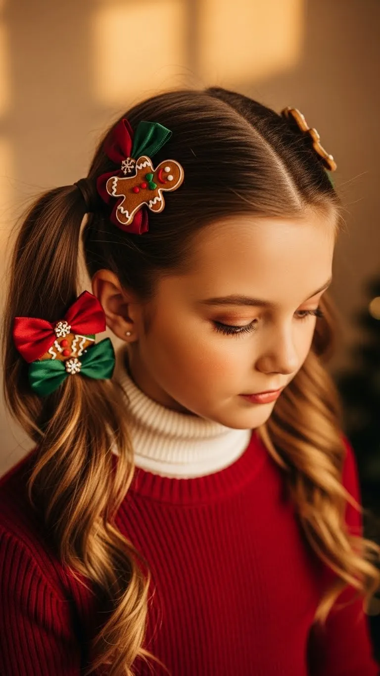 Pigtails never fail for younger kids, and adding gingerbread clips makes them extra fun. Part the hair evenly and secure two mid-level pigtails. Clip small gingerbread men near each elastic. You can find these clips at craft fairs or make them using felt shapes glued to alligator clips. This hairstyle works for all hair textures. You can wrap brown ribbon around each pigtail for a gingerbread-like color theme. Keep the elastics soft so they don’t tug. This style stays put through hours of playtime and still looks sweet in family photos.