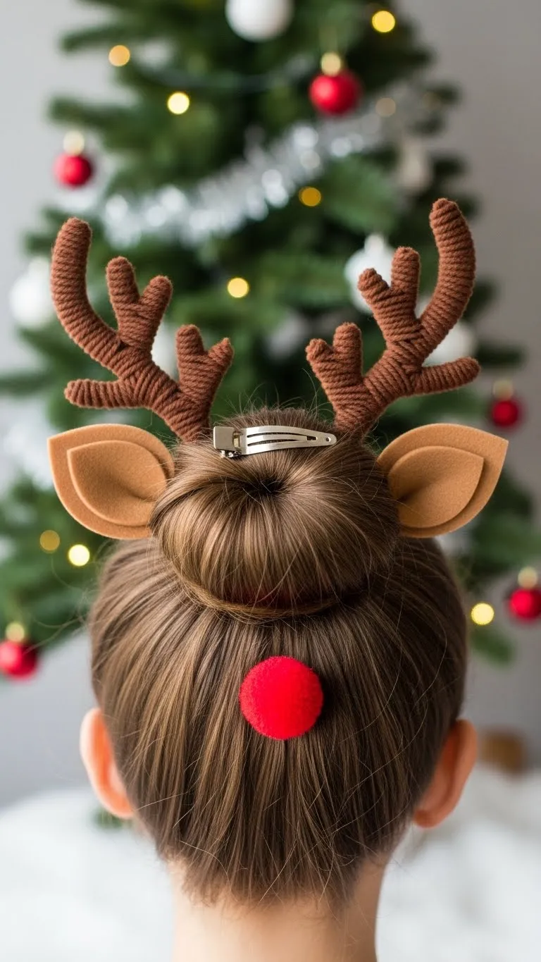 This bun transforms into a reindeer with two clip-on felt antlers. Create a tight bun, then clip the antlers above it. Add a little red pom-pom at the bottom to mimic a nose. Use foam antlers for comfort. Kids enjoy this whimsical style for school events. If you want something even softer, craft your own antlers using pipe cleaners wrapped in brown yarn. The style takes only minutes and stays secure. It also works for short hair if you create a small faux bun with a bun maker.
