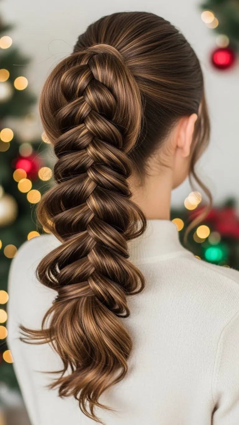 This braid gives a fuller look without needing advanced skills. Tie your hair into a ponytail. Then section it into smaller parts and pull each through the one above. The result looks thick and detailed. Add glittery clips for a holiday touch. If you have fine hair, lightly tease the ponytail before starting. This makes the loops appear bigger. Elastic packs from dollar stores are enough for this style. It stays neat for hours, making it great for busy nights.