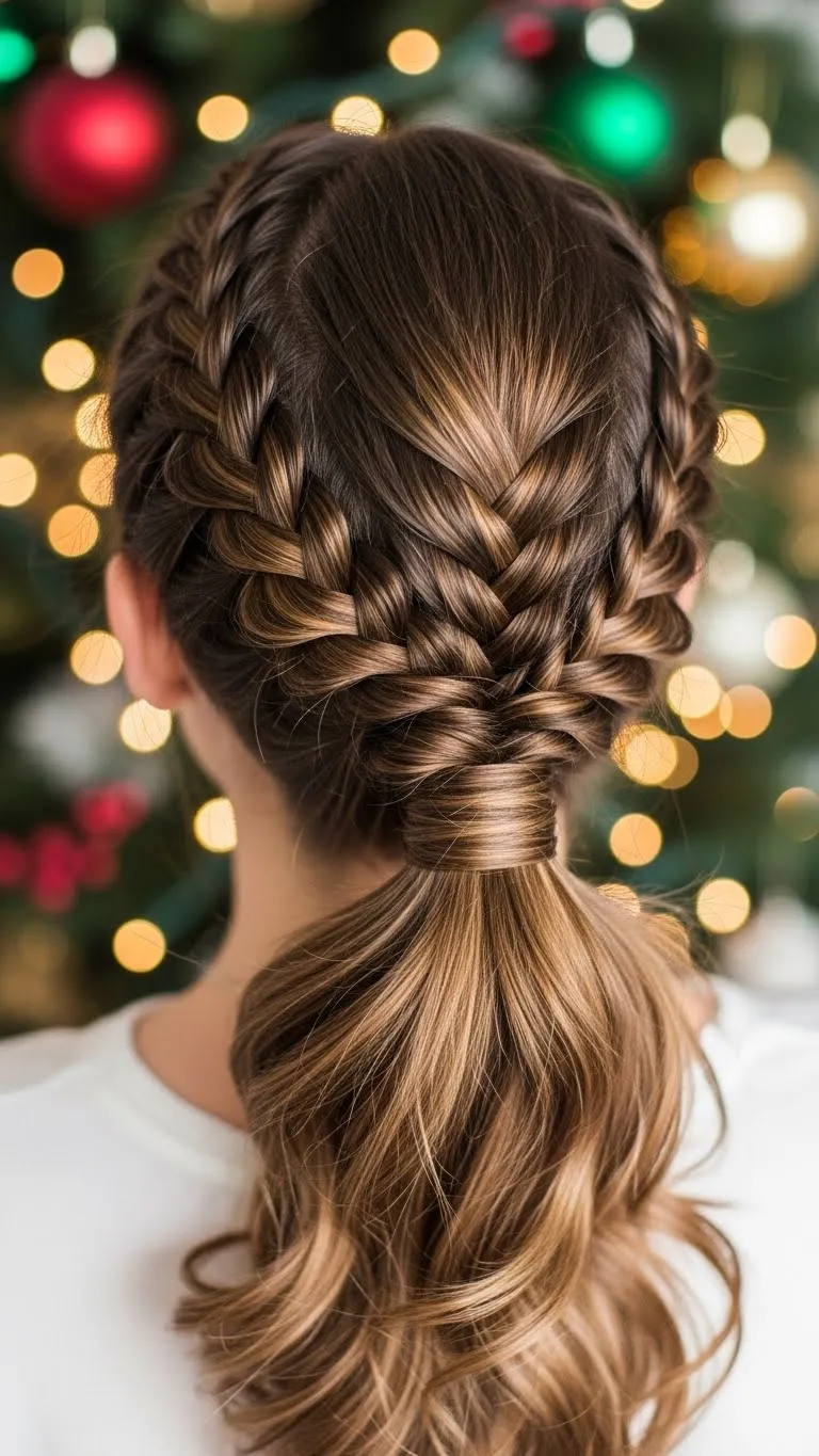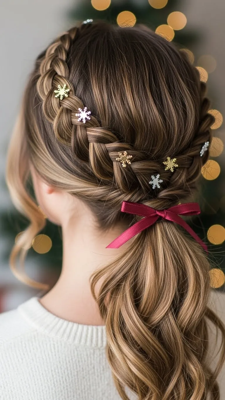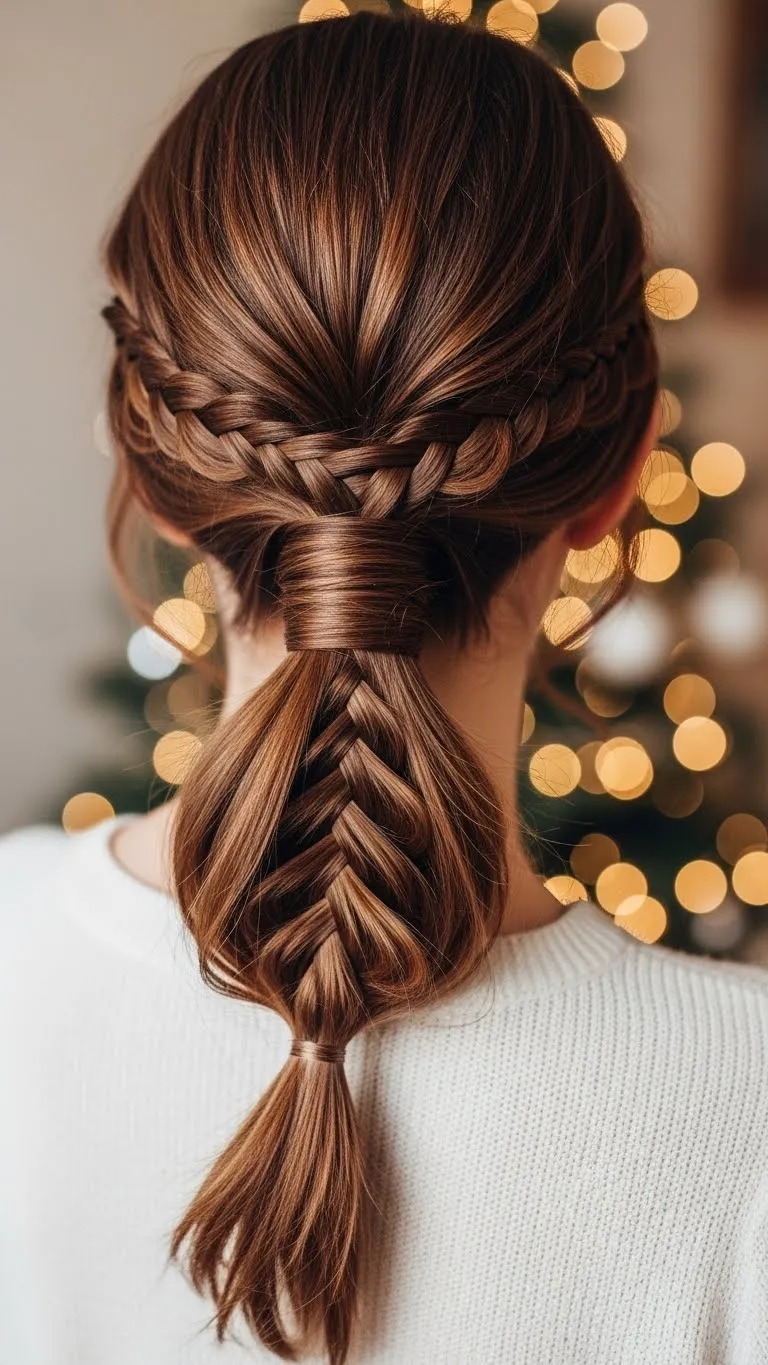 Start with a fishtail braid at the top and flip it inward at the base. Tie the rest into a pony. Pull the braid slightly for fullness. This style looks detailed but only requires basic steps. Add a simple bow for a holiday feel. Use basic elastics and bobby pins — no need for fancy tools. It stays neat while still looking playful. Ideal for medium or long hair.