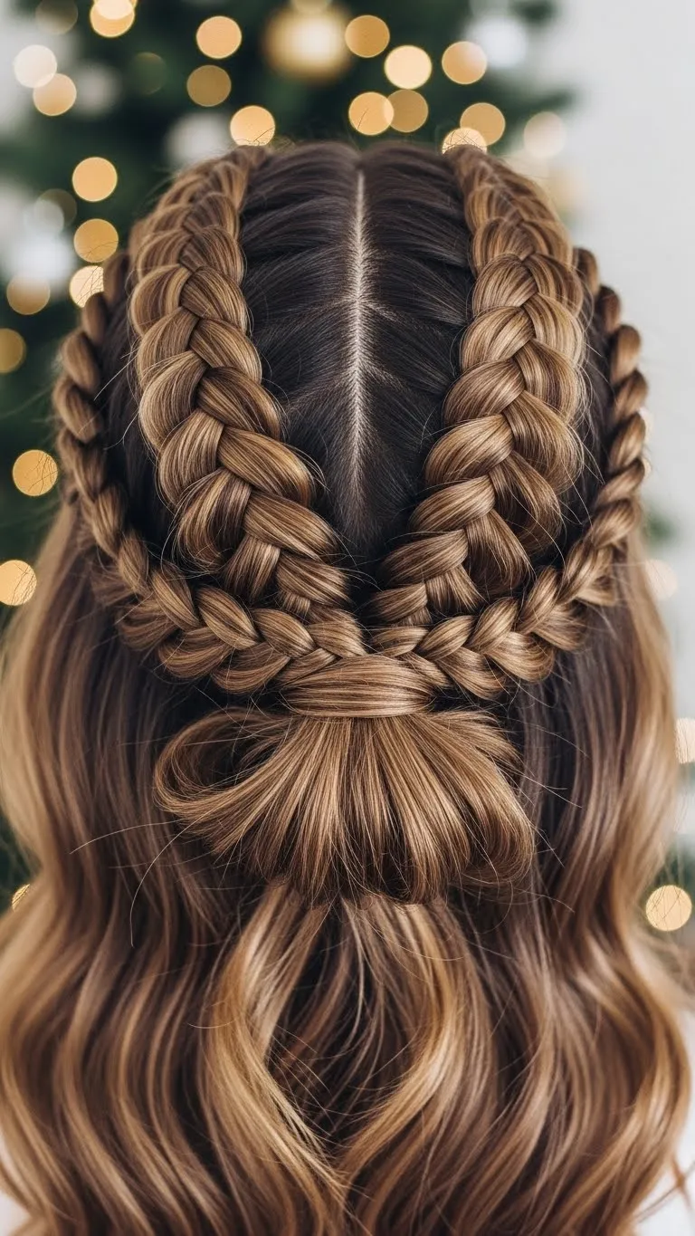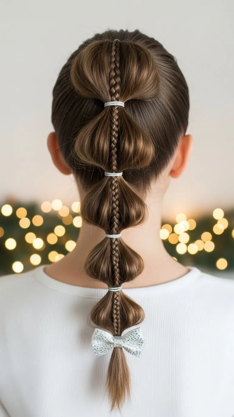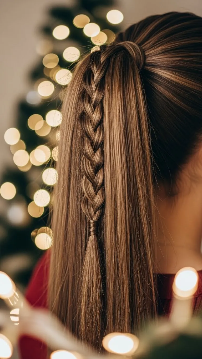 Start with a fishtail braid at the top and flip it inward at the base. Tie the rest into a pony. Pull the braid slightly for fullness. This style looks detailed but only requires basic steps. Add a simple bow for a holiday feel. Use basic elastics and bobby pins — no need for fancy tools. It stays neat while still looking playful. Ideal for medium or long hair.