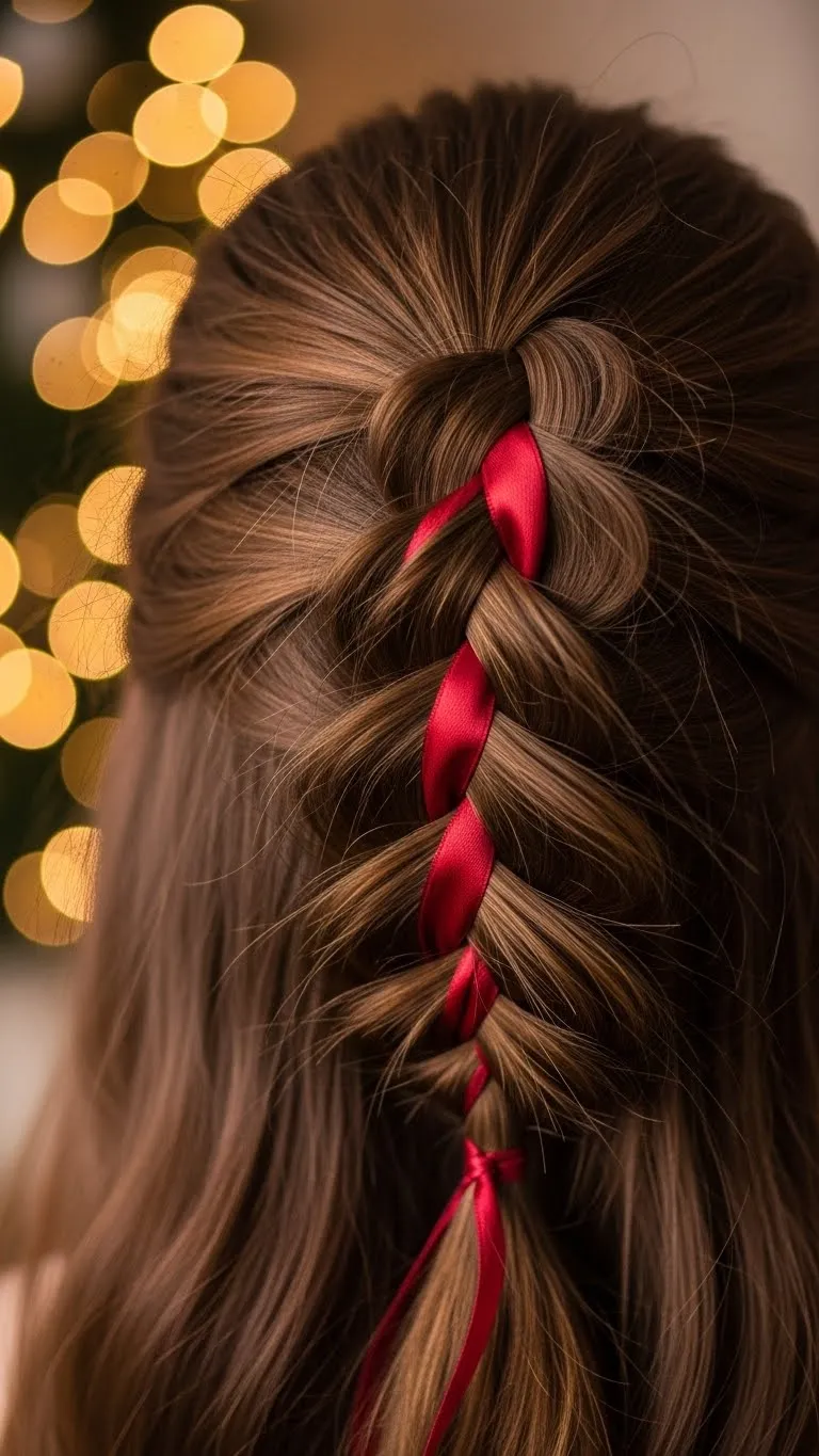 Start with a loose French braid and weave a thin ribbon through as you braid down. This adds color and holiday charm. You can find low-cost ribbon in many shops. Pull the braid slightly so it looks soft. Let a few strands fall around the face. This style suits long and medium hair. It’s a gentle, photo-friendly choice for evenings.