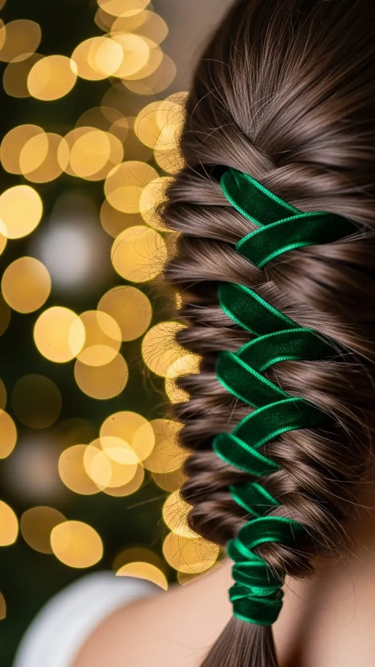 A fishtail braid looks detailed without needing much skill. Start by splitting your hair into two sections. Move thin pieces from one side to the other until you reach the bottom. Tie it with a small elastic. Then wrap a velvet ribbon around the base or down the braid. Velvet looks festive and cozy for December. You can buy a meter of ribbon for very little money and reuse it. Leave some strands loose at the front to soften the style. If your braid feels thin, gently pull the sections apart. This makes it appear fuller. The fishtail holds well on long hair but also works on shoulder-length hair if you curl the ends first. It photographs beautifully under warm lights and adds texture to simple outfits.