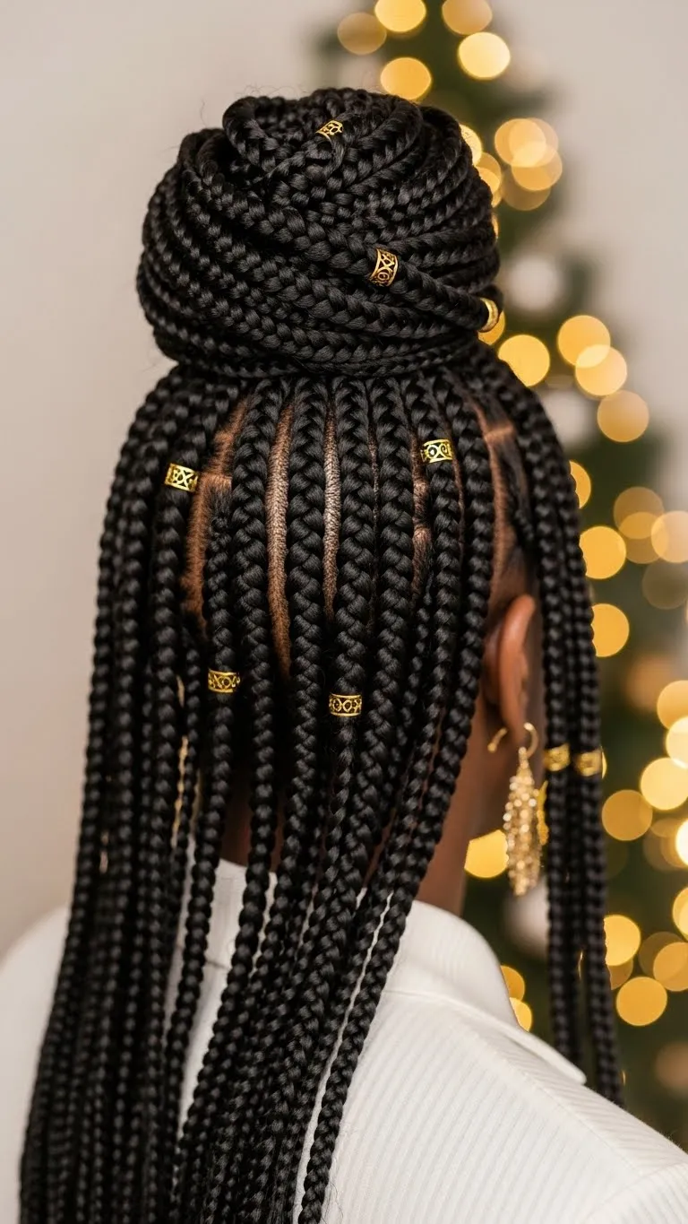 If you already have box braids, this is a party-ready option. Gather the braids into a high or low bun. Wrap them around and tuck the ends. Add gold cuffs or rings for a festive touch. These accessories are inexpensive and reusable. This look stays secure for hours, making it ideal for long events. You can smooth the edges with gel for a clean finish. If you prefer softness, leave two braids down at the front. Pair this bun with statement earrings or a bold lip color. It’s comfortable and easy to redo anytime.