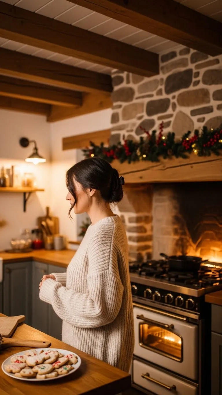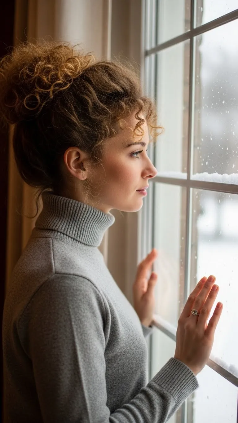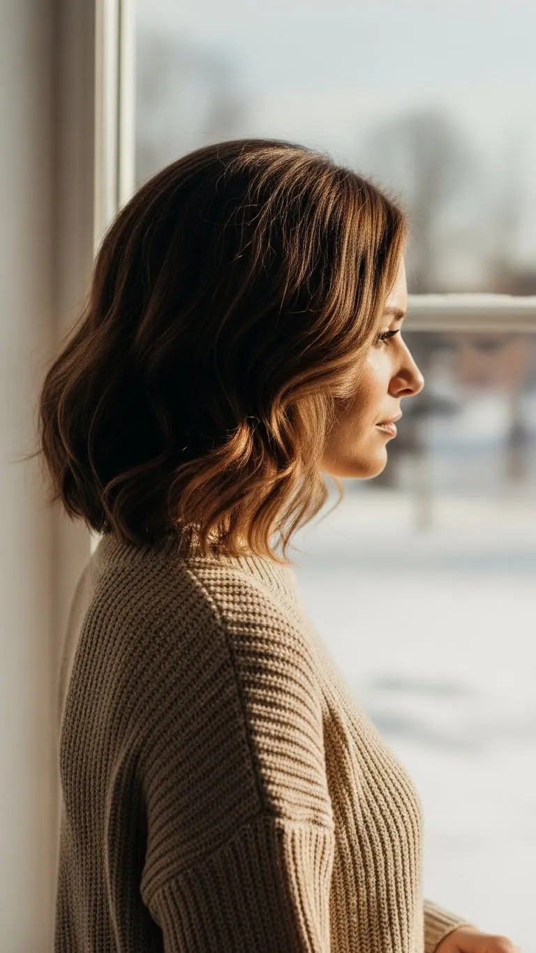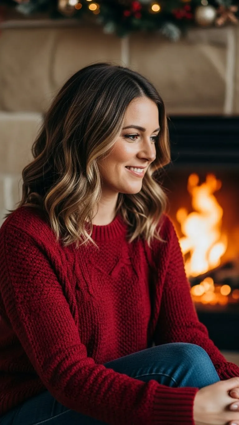 A messy bun works when you want comfort and speed. Gather your hair high or low depending on your sweater collar. Twist it and pin it loosely. Don’t worry about perfection. A few stray pieces make it look soft. If you want more volume, tease the crown lightly with a small comb. A drugstore texture spray can help the bun stay full without flattening. Wrap a scrunchie around the base if you like a playful touch. This style holds well through cooking, unwrapping gifts, and quick errands. It feels casual but still looks intentional.