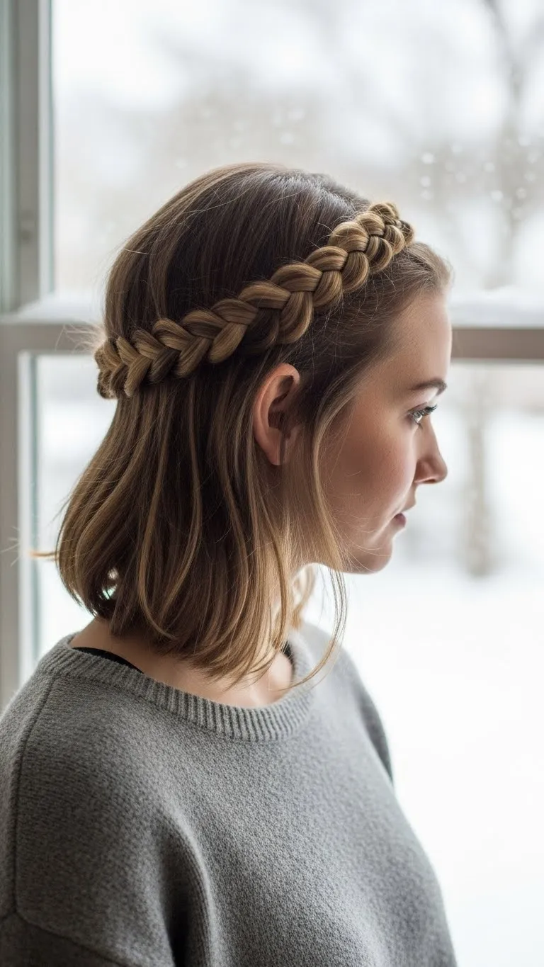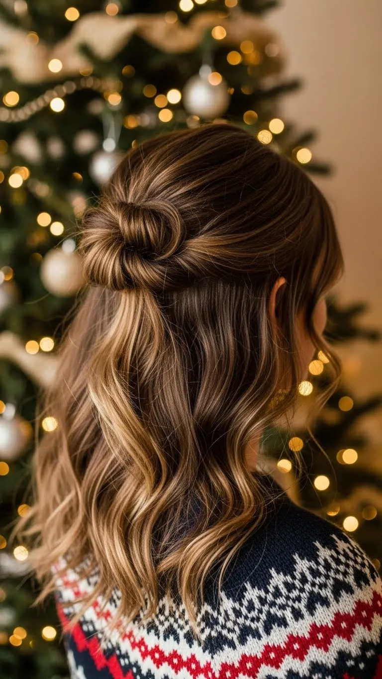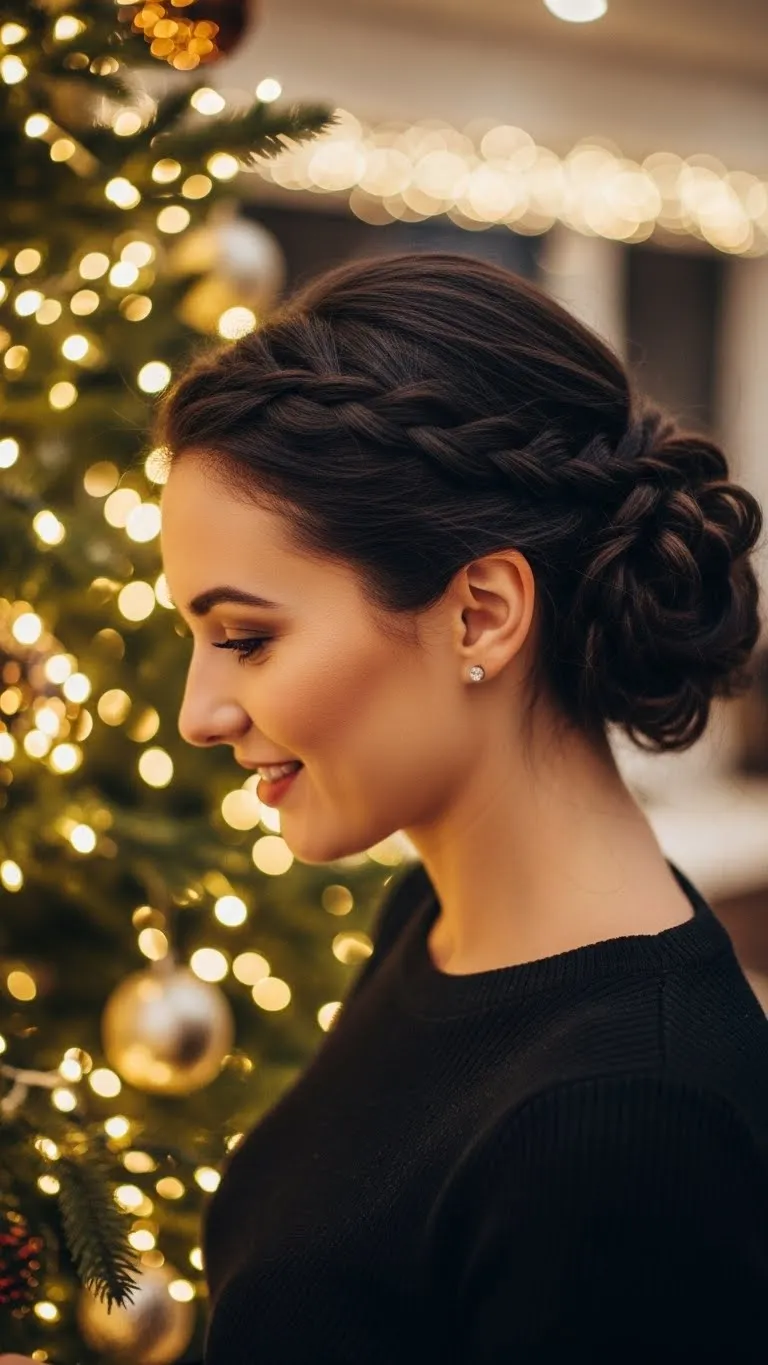 A braid across the top of your head gives a cute holiday feel. Take a small section behind your ear, braid it, and bring it across your head. Pin it on the opposite side. Repeat with the other side if you want a thicker band. Smooth the top with a tiny bit of cream so it looks tidy. This style works well on medium or long hair. If your hair is short, use a small braided extension, which costs very little and blends easily. It stays comfortable all morning and pairs well with cozy outfits.