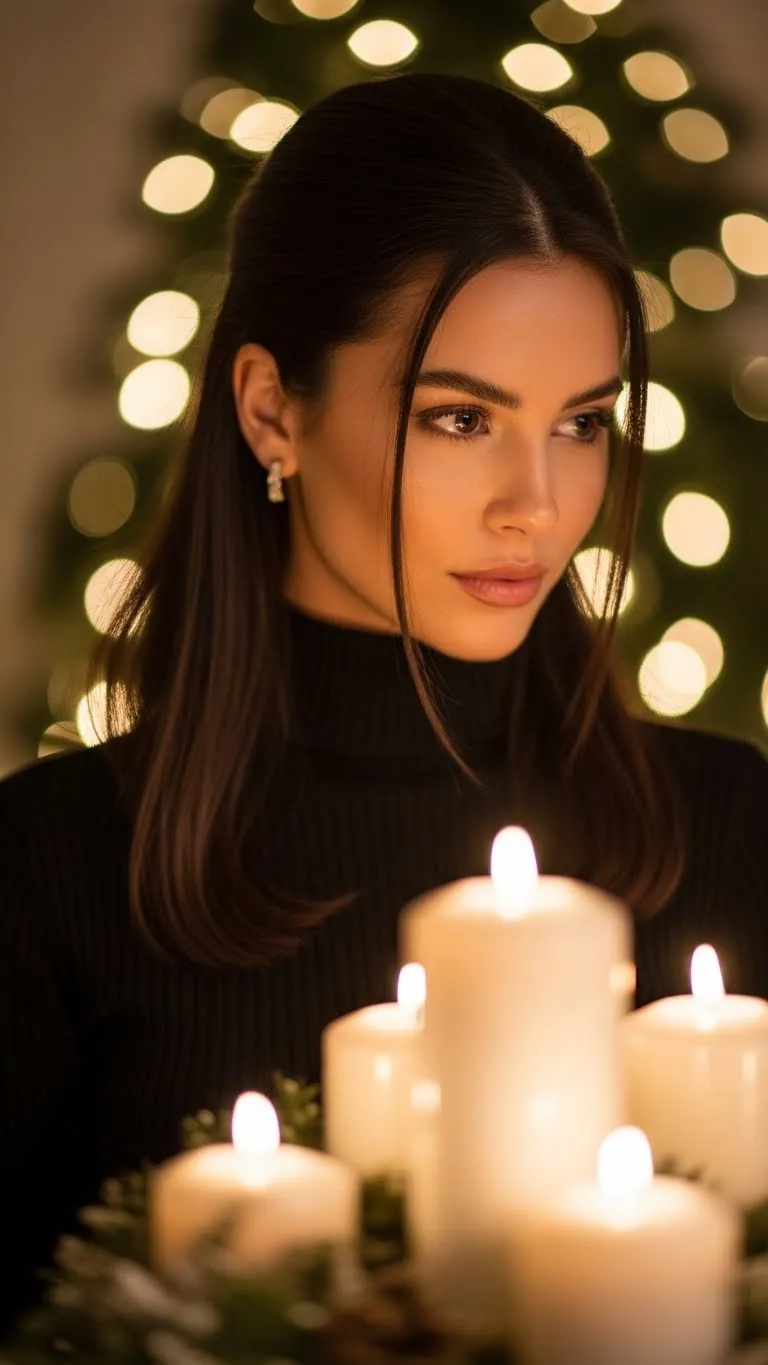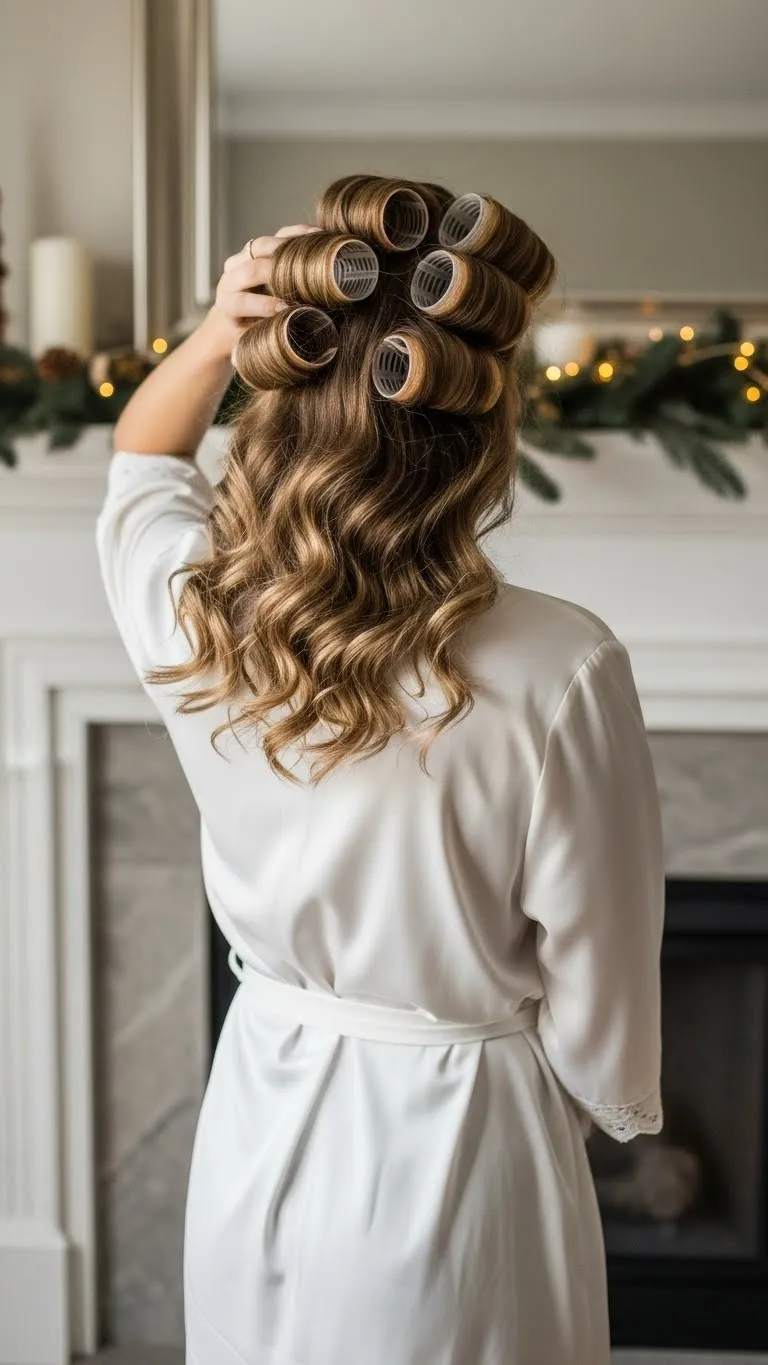 Side-swept curls bring softness and a bit of drama without being too formal. Curl your hair in large sections. Sweep everything to one side and secure the back with a hidden pin. Let a few shorter strands fall forward. Add hairspray only at the roots so the curls stay light. If curls fall quickly, set them with rollers while doing makeup. This style pairs well with warm sweaters and holiday pajamas. It looks great in every angle for photos.