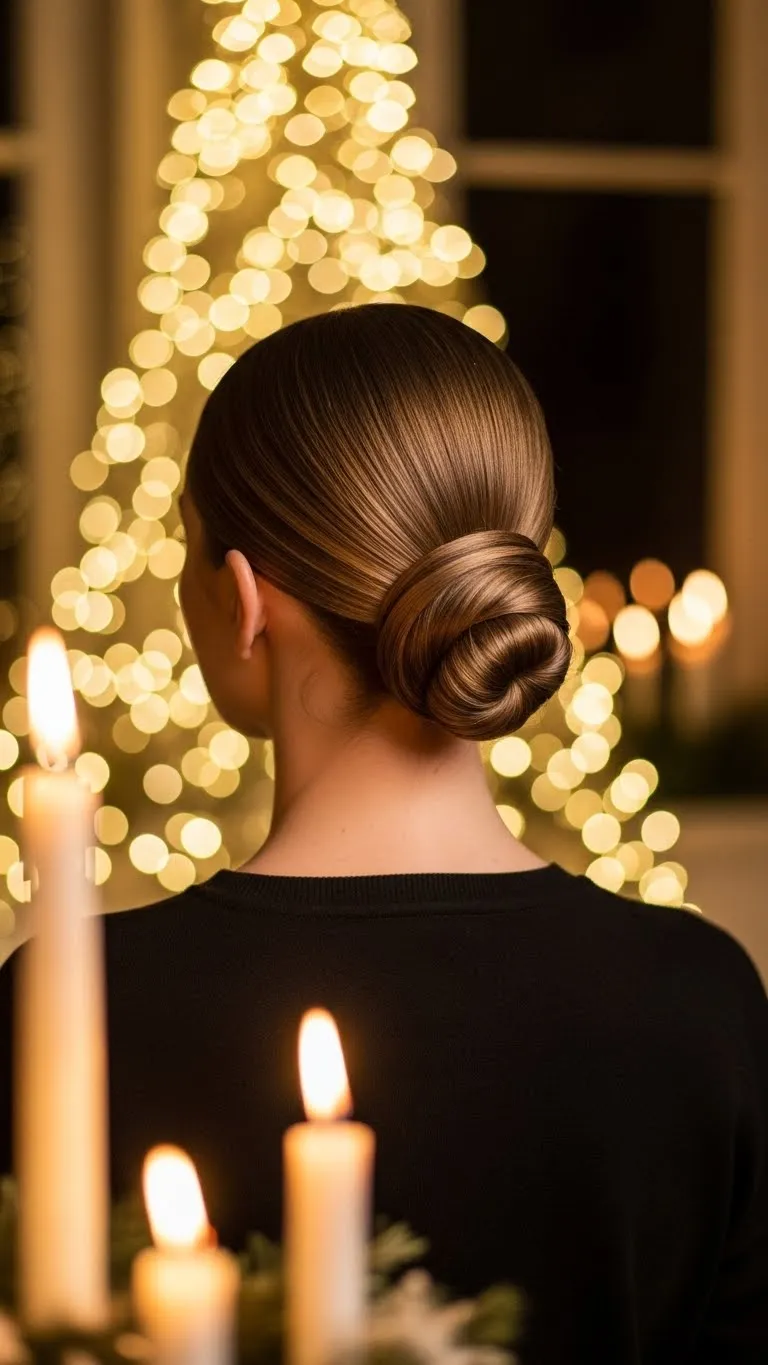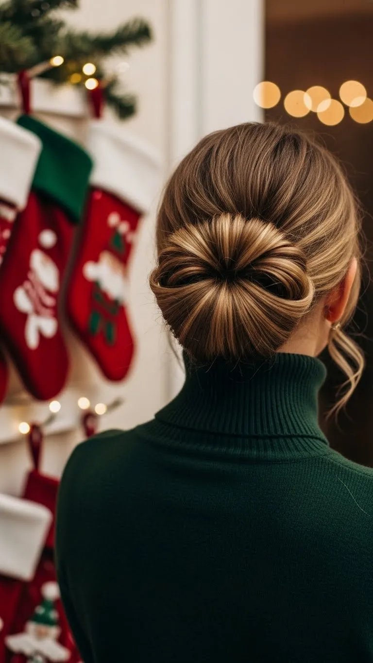 This bun looks more detailed than it is. Create two low ponytails, twist each, and cross them over one another into a bun shape. Pin in place using three or four bobby pins. For smoother sections, brush each ponytail before twisting. If you want a softer finish, pull a few strands loose around your ears. It stays secure even with fine hair. A dab of budget-friendly gel helps control frizz. It’s a great option for family gatherings or quick Christmas brunch setups.