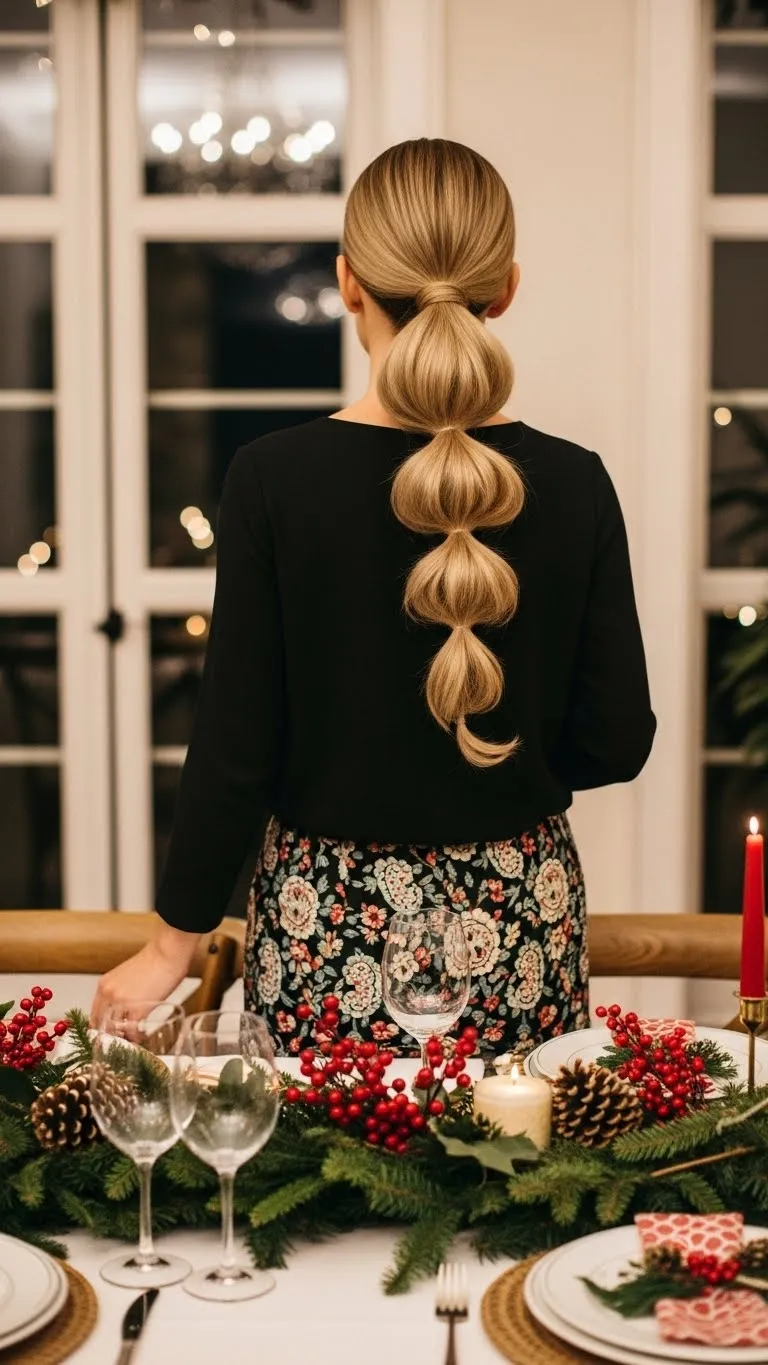 A bubble ponytail adds shape without much work. Start with a low ponytail. Add elastics every few inches. Gently pull each section to create round “bubbles.” This looks stylish yet relaxed. If your hair is short, add fewer bubbles. If it’s long, add more. Use small clear elastics from any budget shop. You can even wrap a ribbon at the top for a holiday touch. The style stays neat all day.