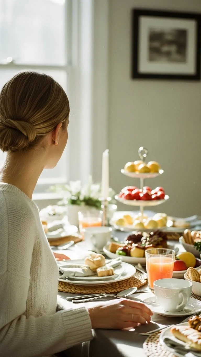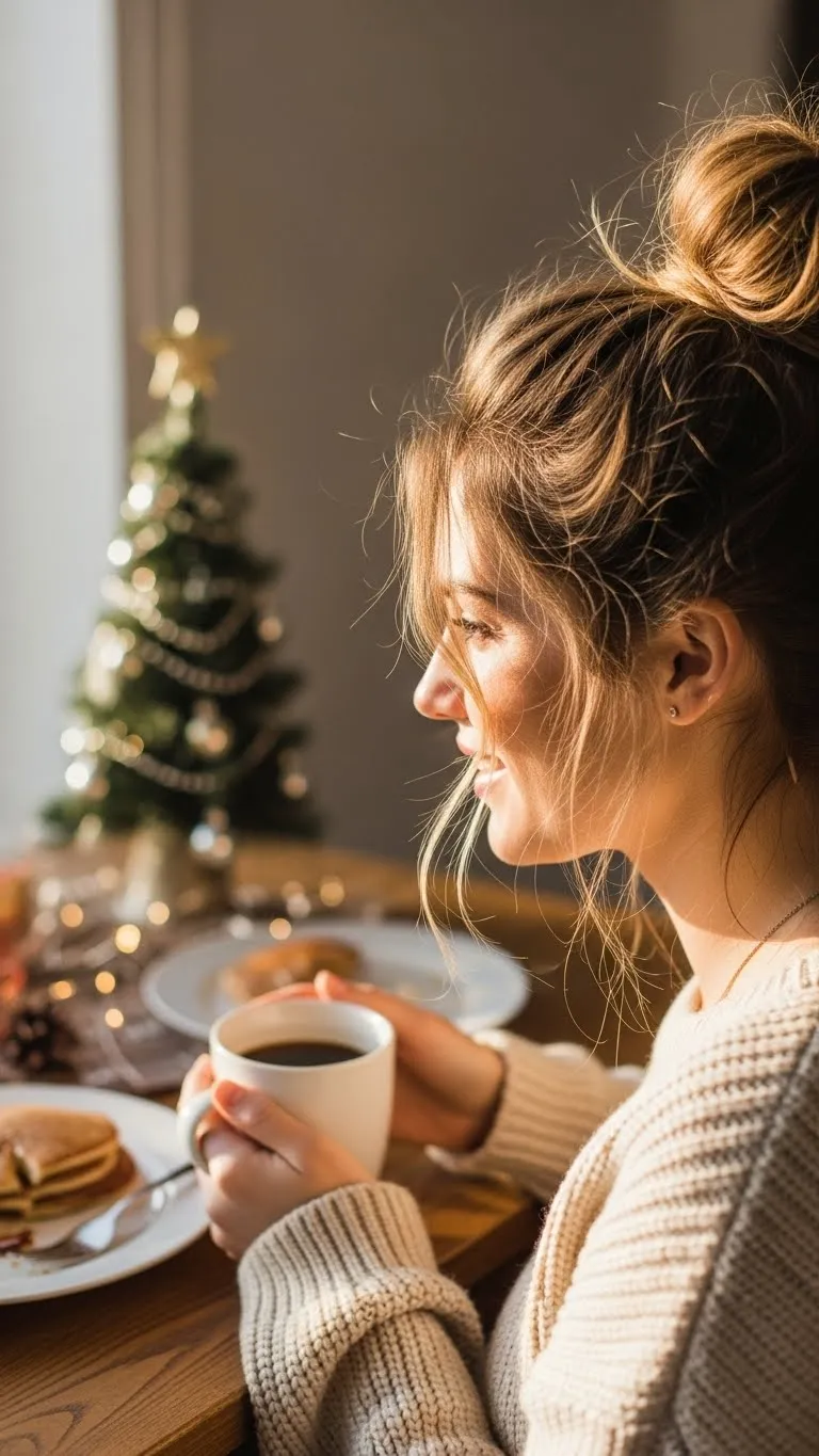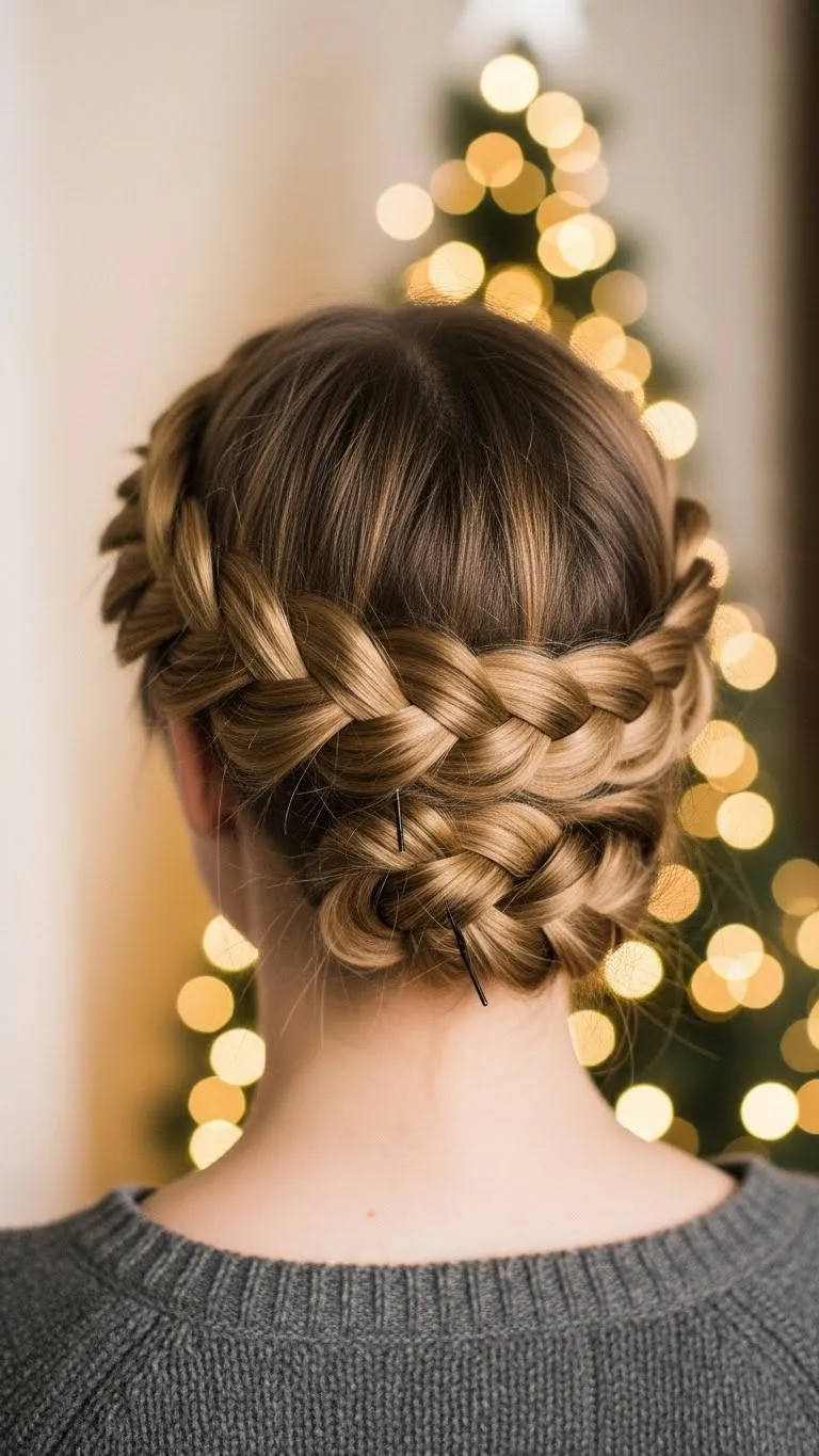 A crown braid feels special for Christmas morning. Start at one ear and braid around the head. Pin the end under the braid. It looks detailed but holds well. If braiding around your head feels hard, create two braids and pin them across instead. Add a bit of hairspray for hold. This style keeps hair away from your face while opening gifts or preparing breakfast.