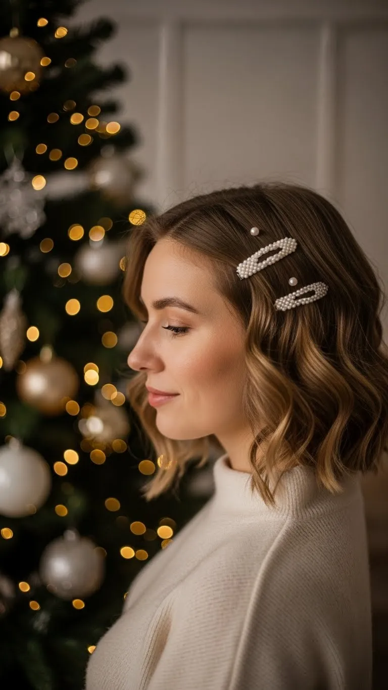 Little clips can transform simple waves into something sweet. Scatter mini clips along one side or place a few near the front. You can buy them cheaply or reuse old ones. Keep the hair soft and natural. Use a bit of water to refresh waves if needed. This style takes under two minutes and gives a light holiday sparkle without too much detail.