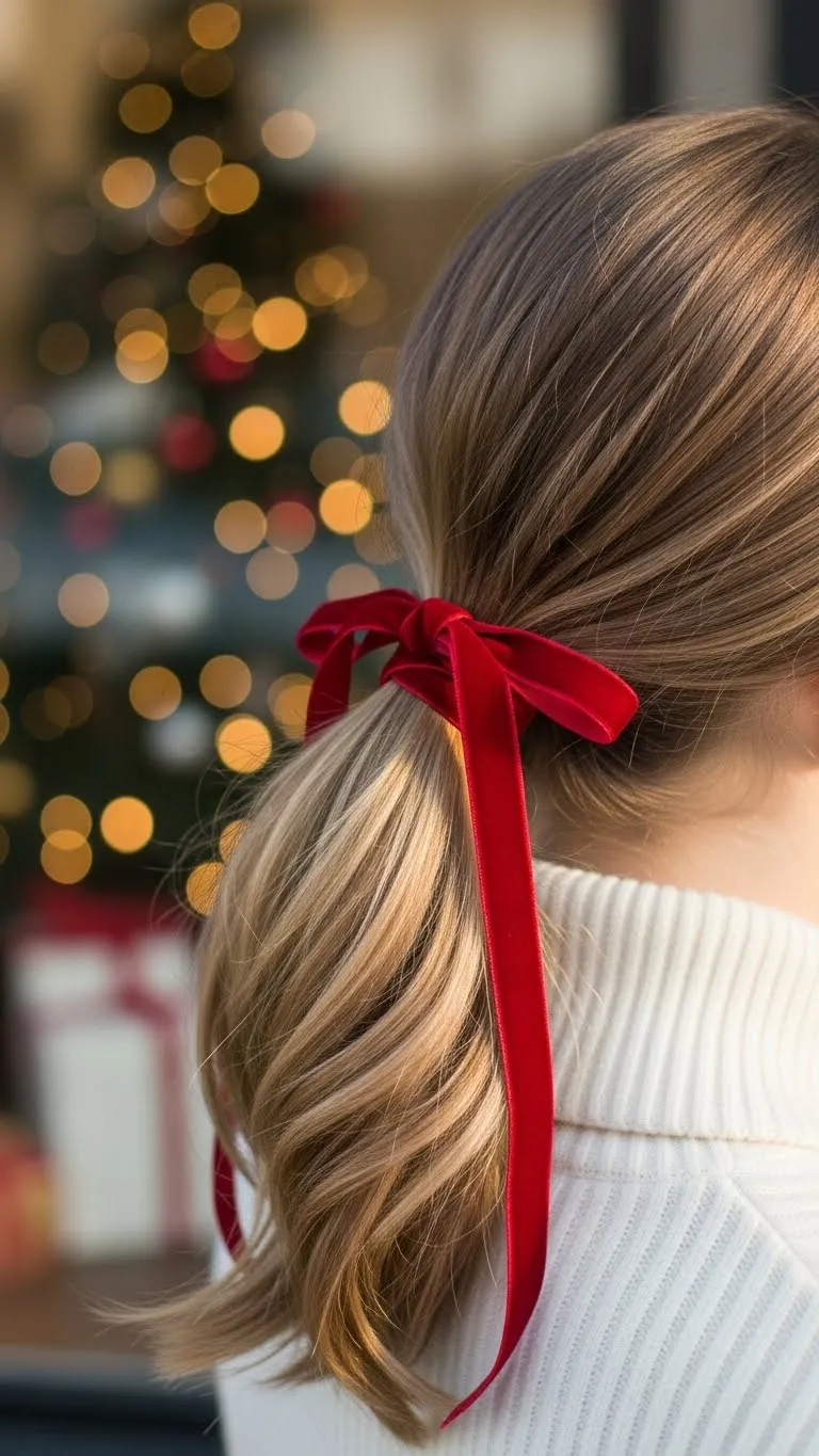 A low ponytail always feels simple, but a ribbon adds a holiday touch without effort. Brush your hair smooth, gather it loosely at the nape, and tie it with an elastic. Add a ribbon over the elastic to hide it. Red, white, or plaid works well. Use whatever you already have from last year. Pull a few strands loose for softness. If your hair doesn’t hold shape, mist the base lightly with hairspray. For thicker hair, use two elastics stacked together so the ponytail doesn’t sag. This style works nicely if you’re rushing but still want something pretty for morning photos or brunch. It’s calm, neat, and easy to refresh throughout the day.