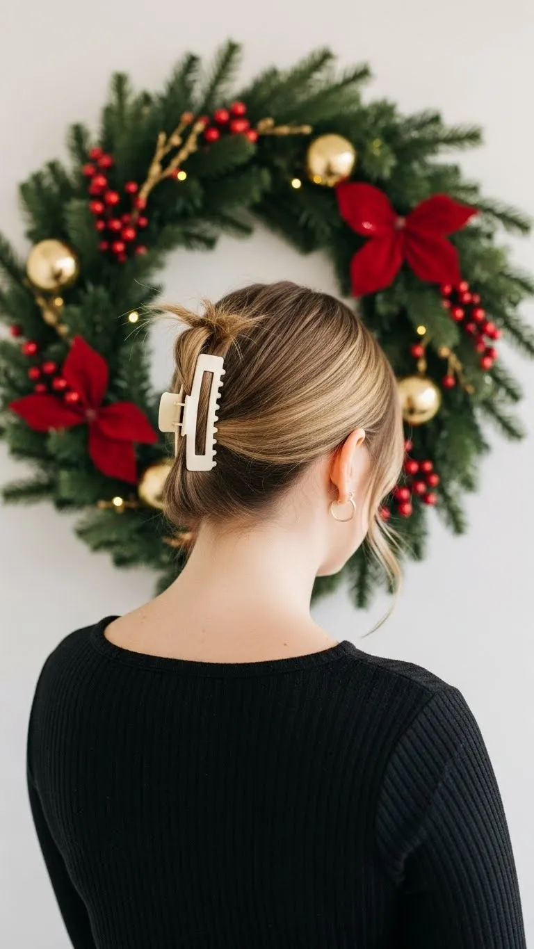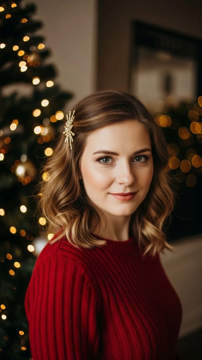 Pinning one side back adds instant charm. Curl the hair lightly or keep it straight. Add a festive pin from last year or use a simple metallic one. This style keeps hair away from your face while still looking soft. It works on short and long hair. You can refresh it anytime with a little water or a quick comb-through.
