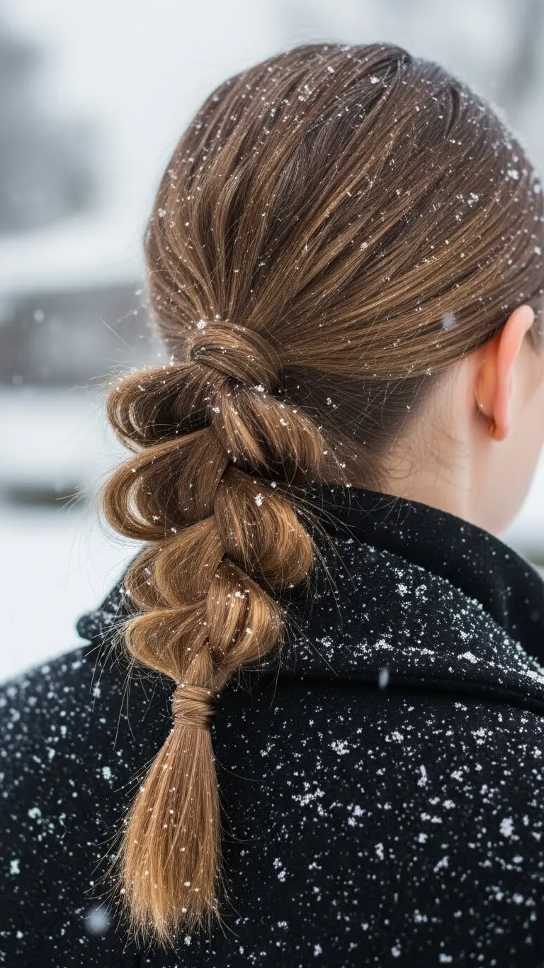 A braided pony keeps your hair neat while still looking festive. Start with a low ponytail, braid it, and secure the end with a small elastic. Pull out sections gently for a soft, fluffy look. If your hair is thinner, add a little powder at the base to give it grip. You can wrap a ribbon around the top if you want a holiday touch. It’s easy to redo if it loosens and works well for busy Christmas mornings.