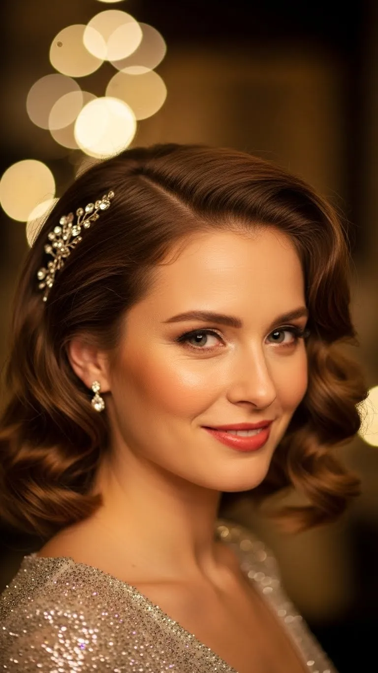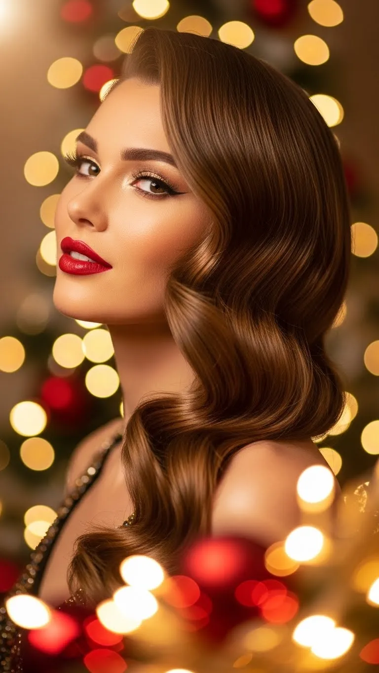 Hollywood waves create a glamorous dinner look. Curl hair in uniform sections and brush lightly to form smooth waves. Hold them with light hairspray. You don’t need pricey tools—any curling wand with a larger barrel works. Add a sparkly clip for the holiday touch. This style photographs beautifully and feels timeless.
