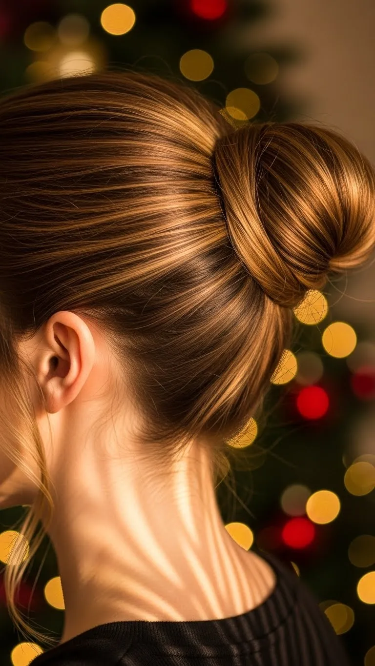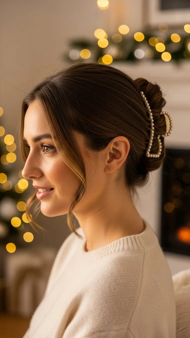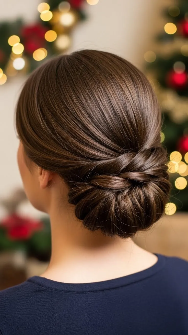 A loose French twist feels relaxed and elegant. Gather hair at the back, twist upward, and secure with a long clip or pins. Leave the ends slightly loose at the top for softness. This style works even if your hair feels slippery—just add dry shampoo for grip. A small pearl pin adds a festive accent.