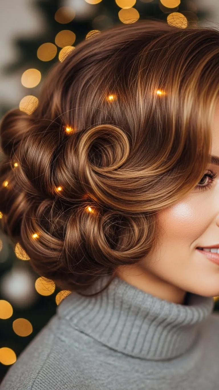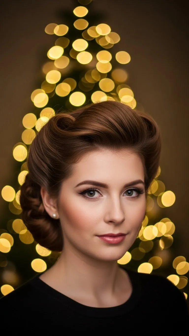 A rolled updo brings a classic charm that suits holiday evenings. Create a low roll by tucking hair inward using a fabric headband as a base. Pin everything securely. Add soft waves to the front for shape. Drugstore pins and a simple headband are all you need. This look stays controlled but feels gentle and romantic.