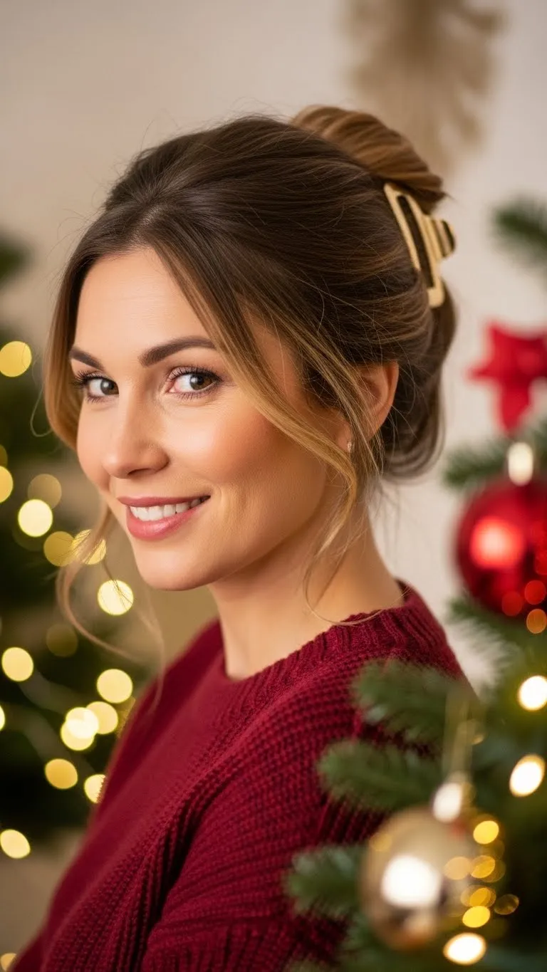 A claw clip twist works when you want something simple. Twist your hair upward and secure with a medium or large clip. Let the ends fan out slightly at the top. For shorter hair, twist smaller sections instead of the whole bunch. Claw clips are inexpensive and come in pretty metallic shades perfect for Christmas. This style keeps hair off your back while still looking stylish.