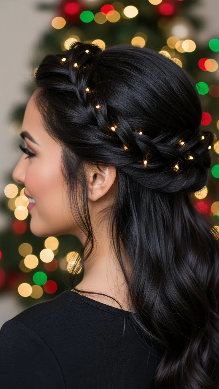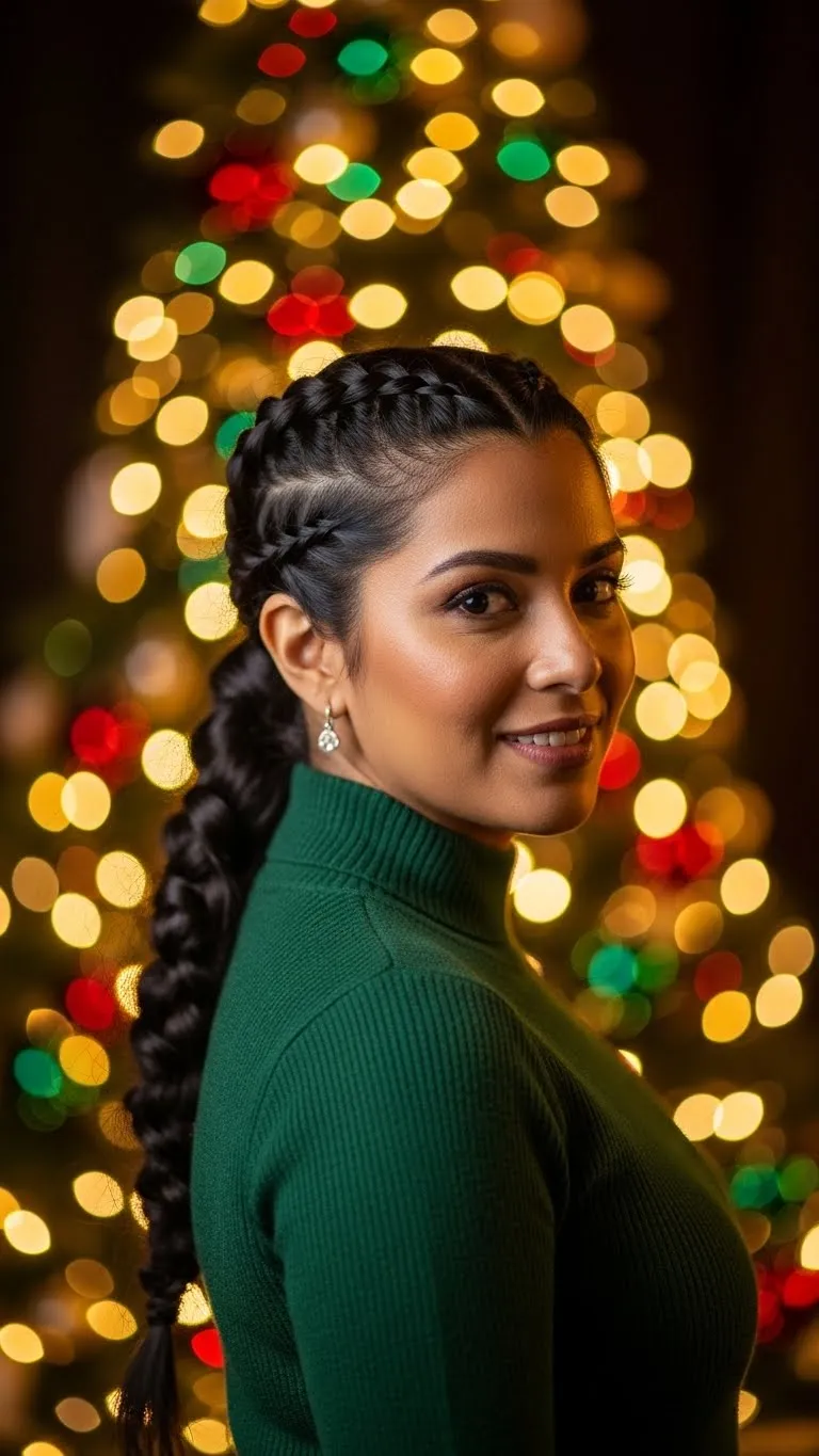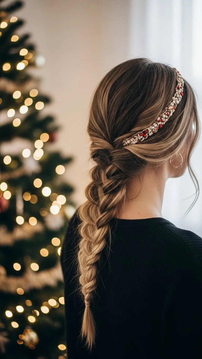 A loose boho braid keeps things relaxed but still dinner-friendly. Start with a side part, then braid your hair over one shoulder. Pull gently at each section to give it airy texture. This keeps the braid from looking tight or pulled. If your hair is layered, let some strands fall out naturally—they add charm. Use a basic clear elastic and cover it with a ribbon or tiny bow for the Christmas vibe. You don’t need perfect braiding skills. Even a messy version looks intentional. If your hair is thin, add dry shampoo beforehand for extra grip. This braid holds up well and doesn’t frizz easily during warm dinners. It’s simple, pretty, and a great go-to if you want something quick.
