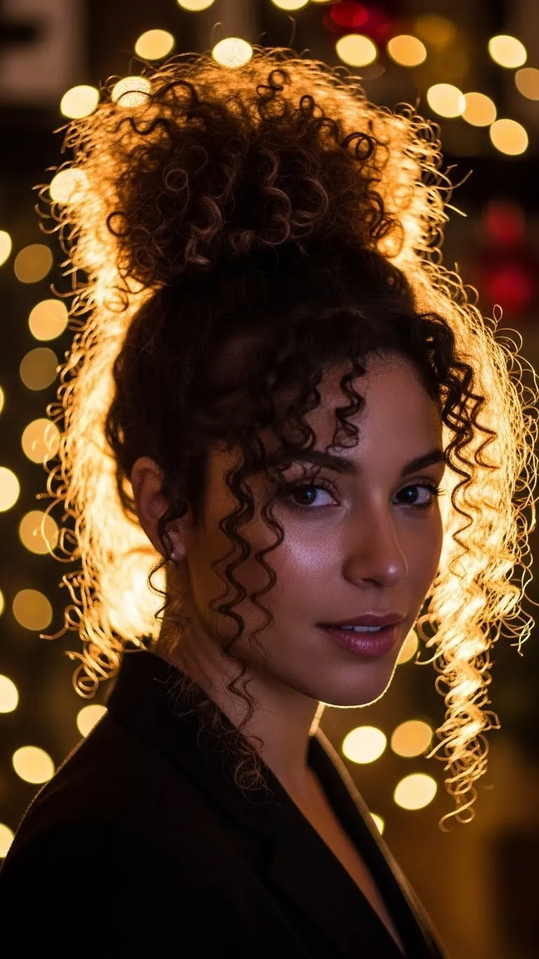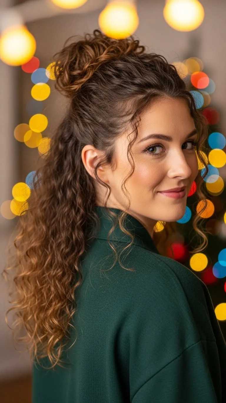 A half bun on curly hair feels youthful and airy. Gather the top section and twist it into a small bun. Let the lower curls stay loose. Add a bow or cute clip for festive detail. It’s practical and holds well even with thick curls.
