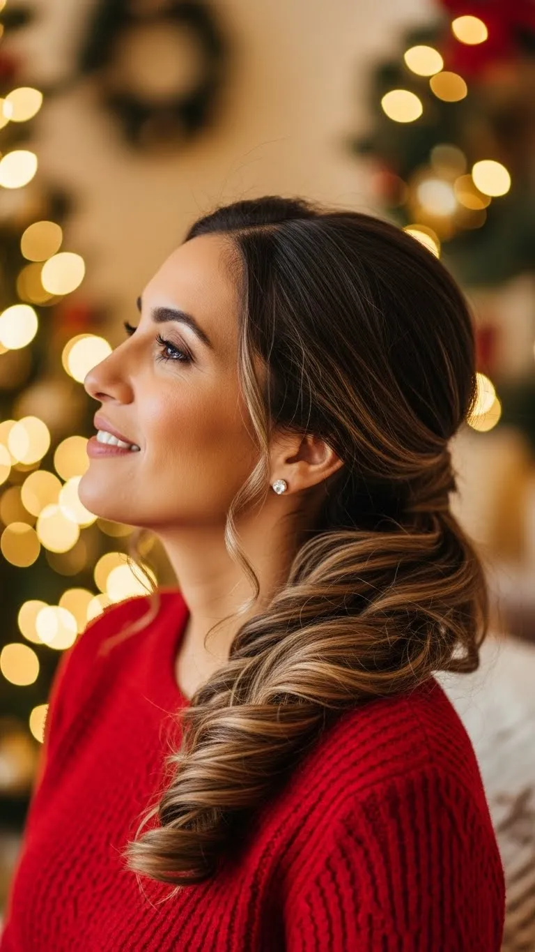Soft waves bring warmth and flow. Sweep them to one side for a romantic look that pairs nicely with holiday earrings. You can get this style with a basic curling wand or even heatless foam rods. Work in light sections to keep everything manageable. Use a small amount of mousse to help the waves stay defined through dinner. A simple bobby pin tucked behind the ear helps hold the sweep in place. If your hair tends to fall flat, flip your head upside down while spraying a light mist of hairspray. This gives your waves a bit more shape without feeling stiff. Try adding a single sparkly pin or clip for a subtle touch. You don’t need expensive accessories—anything from a local market or an old jewelry box works fine. The goal is soft movement, not perfect symmetry. This style looks good with medium to long hair and works whether your texture is straight or slightly curly. It holds up well through an evening of talking, laughing, and enjoying your Christmas meal.