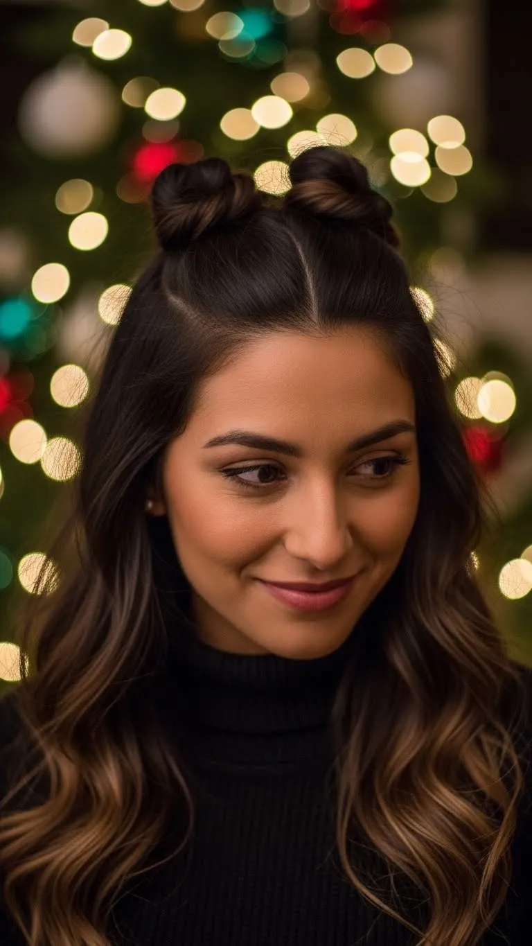A textured low bun looks relaxed and airy. Curl or wave your hair before pinning it into a loose bun. Pull small pieces out for a natural finish. A glittery pin or ribbon can add a seasonal touch. This is an easy option if you prefer volume without height.