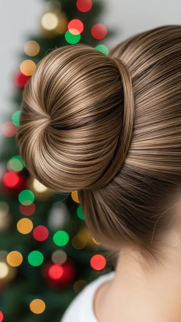 A high wrapped bun gives height and elegance. Pull hair upward into a pony. Wrap the hair around the base until a smooth bun forms. Secure with pins. Add a sparkly scrunchie or thin ribbon for the Christmas feel. This style holds well and keeps hair away from food and warm dishes, making it dinner-friendly.