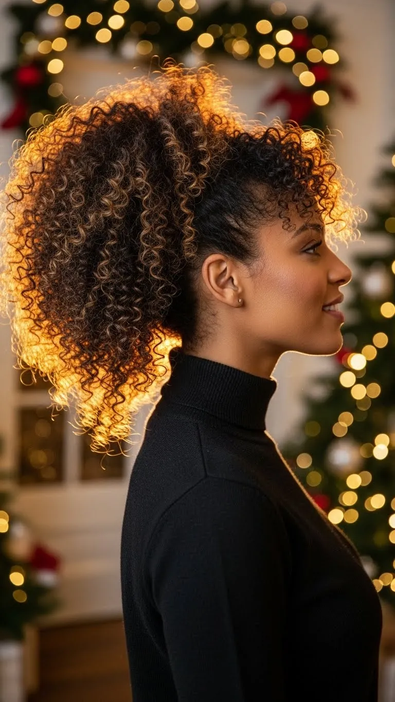 A low puff looks lovely and works especially well for natural hair. Gather your hair at the nape and secure it with a soft band. Fluff the puff gently for shape. Wrap a red or gold ribbon around the base for holiday charm. This is budget-friendly and takes only minutes. Keep the front neat with a bit of leave-in conditioner or gel. The style stays secure while keeping your natural texture front and center.