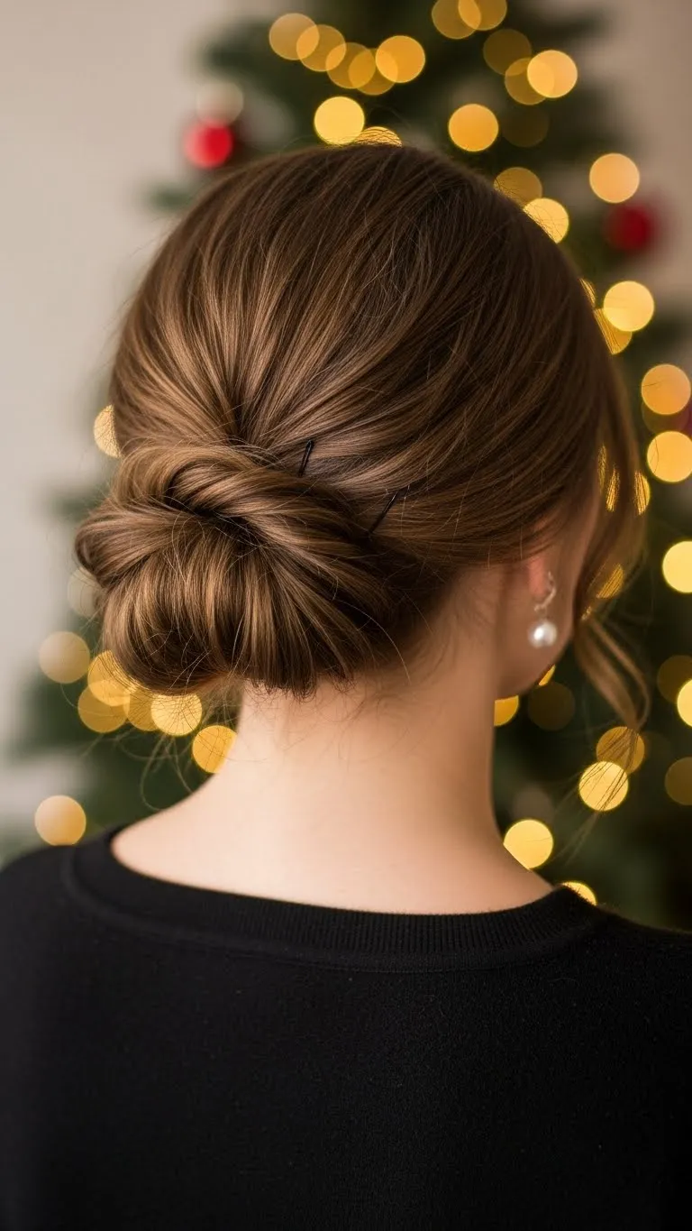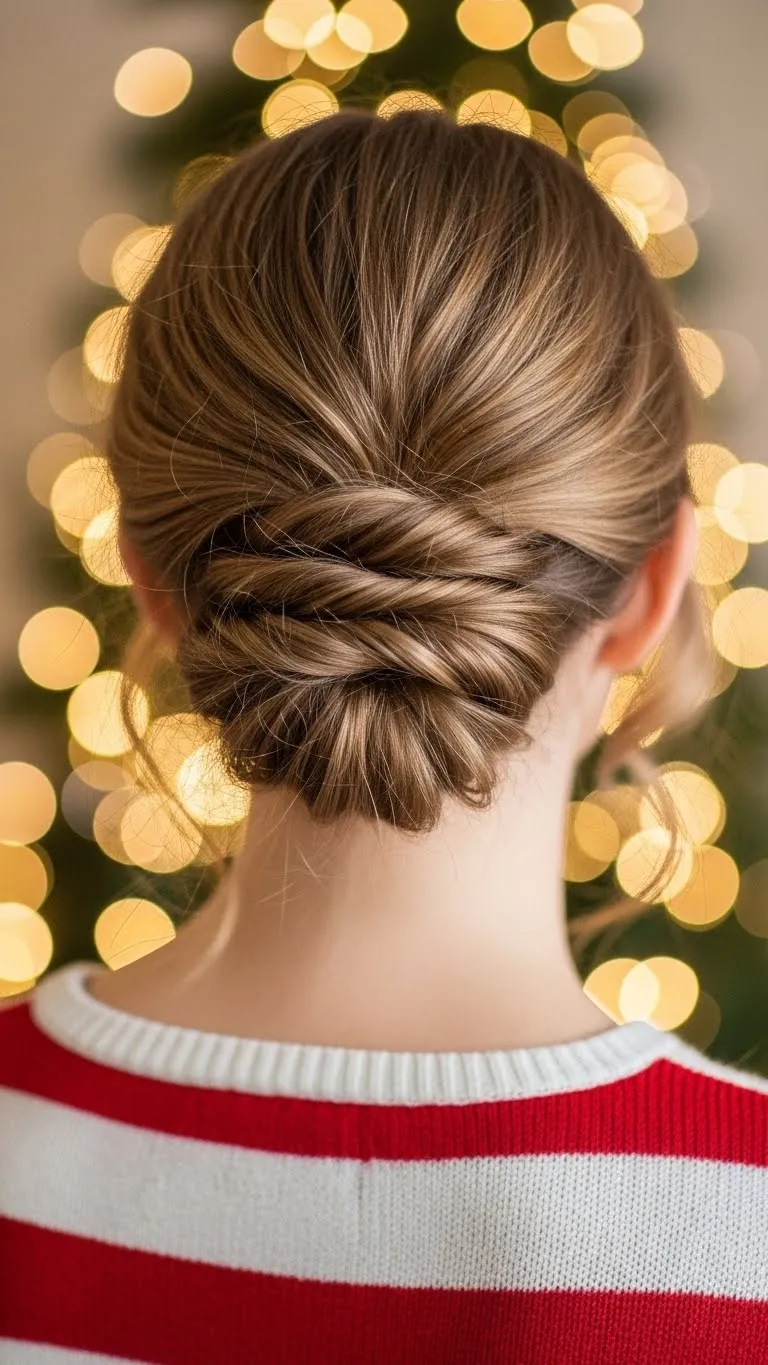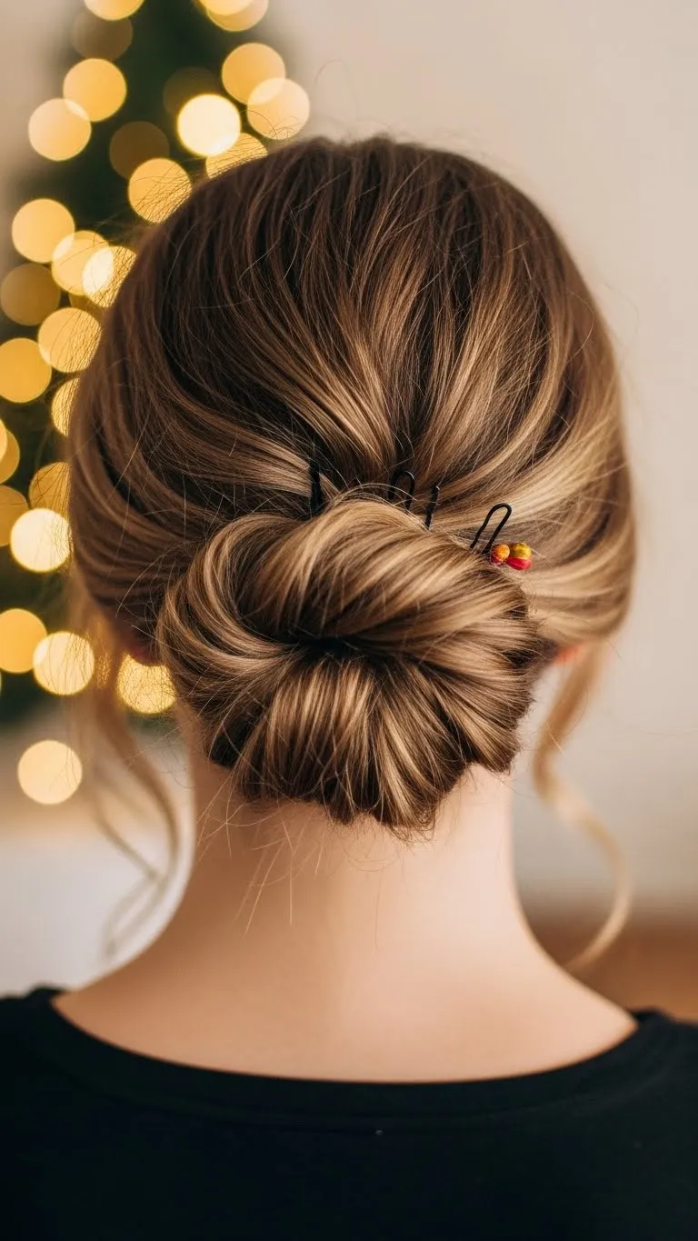 The low twist looks fancy but only takes a few minutes. Gather your hair at the back, twist it inward, and secure with bobby pins. Leave a few strands loose for softness. You don’t need any special tools. Most dollar stores carry simple pins that work well. Add a small holiday clip for color. This style holds best on medium and long hair. If your hair is very straight, add a bit of water for grip. It feels comfortable and stays neat through your evening plans.