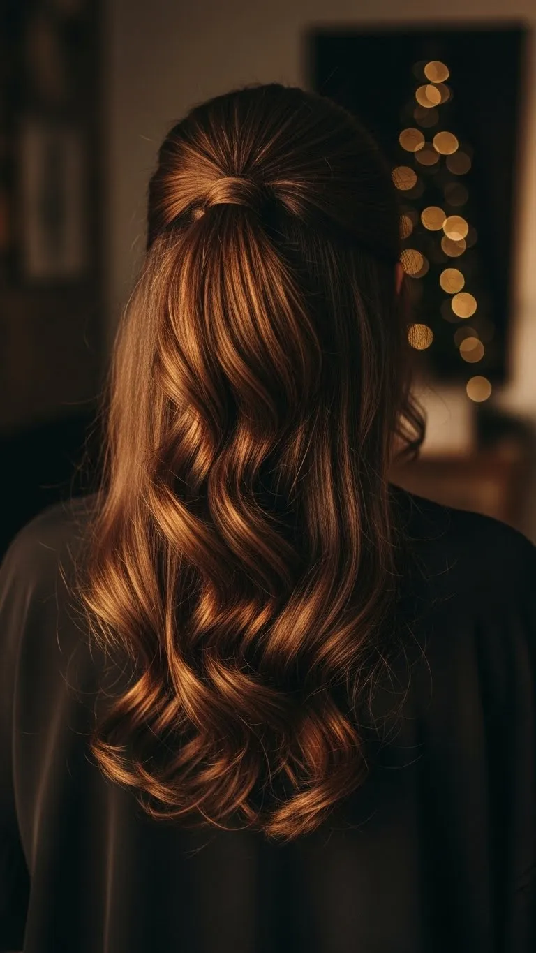 A half ponytail always feels festive. Gather the top section and secure it loosely. Pull the crown upward with your fingers to add gentle height. You don’t need heavy teasing. A little lift creates a soft shape that photographs well. You can wrap a thin ribbon around the elastic. This style works for all hair types. If your hair is fine, use a small elastic so it doesn’t slide. The look stays comfortable and adds extra charm with minimal effort.