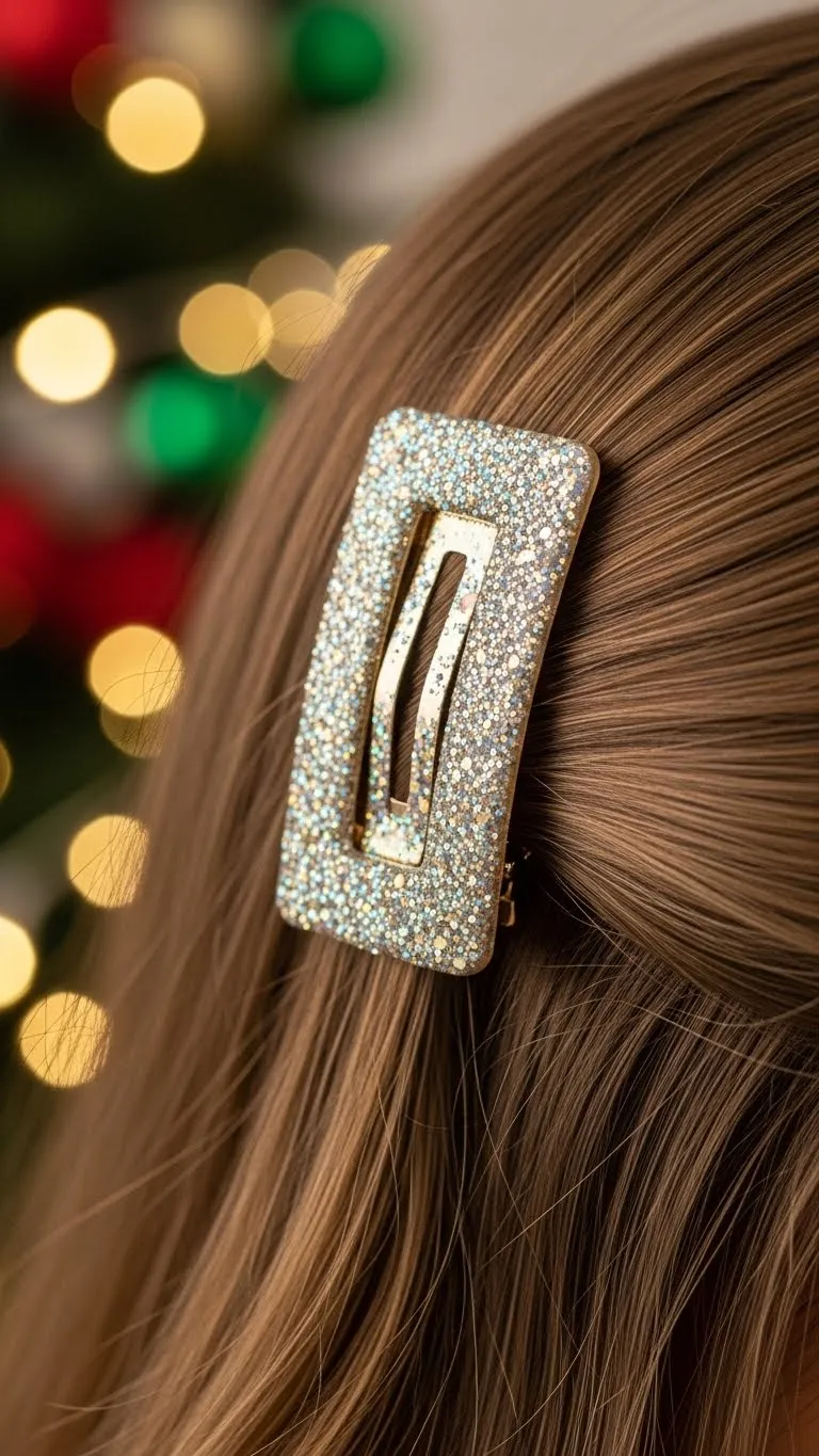 A glitter barrette brings just enough sparkle for Christmas Eve. Brush the front section to one side and secure it with the barrette. You can find these clips for very little at beauty shops. Keep the shape soft for a relaxed feel. Works for straight or wavy hair. If your hair is thick, choose a slightly larger clip so it stays put. You can match the clip color to your outfit. This style is simple, quick, and elegant.