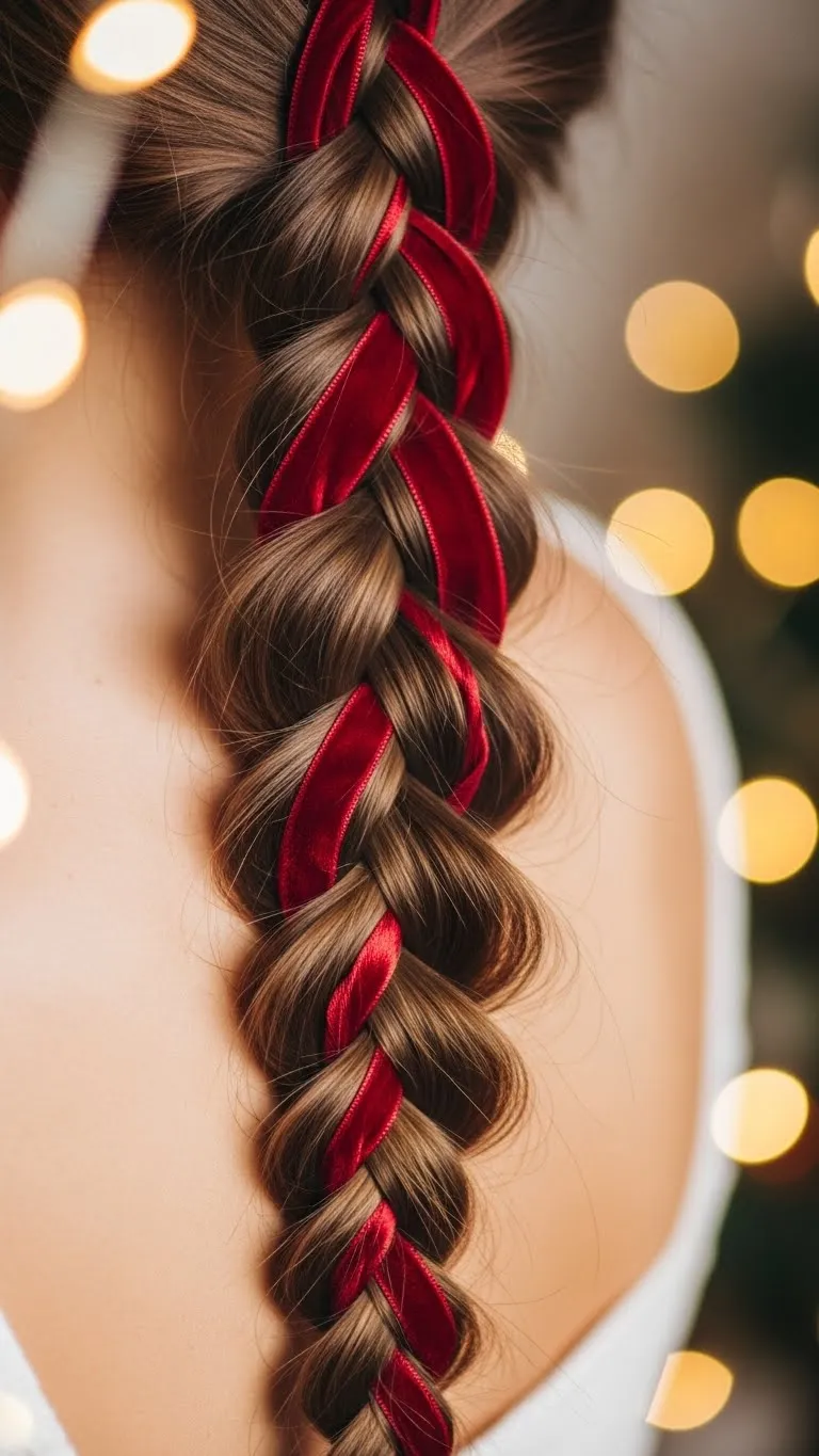 Weaving a ribbon through a braid adds an easy holiday touch. Use any satin ribbon you already have at home. Braid the hair normally and thread the ribbon through as you go. It doesn’t need to be perfect. The loose look feels natural. If your hair is short, use a half braid. Ribbons cost very little, and you can pick colors that match your outfit. This style stays secure and comfortable.