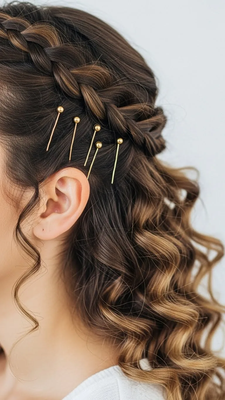 Gold pins add charm to loose curls. Create curls using braids or a quick heat method. Place two or three gold pins above one ear. These pins are cheap and easy to find. Keep the placement simple so the look stays soft. This style works well for photos. If your curls fall, scrunch them gently with water. You can reuse the pins for future events, making this an affordable holiday choice.