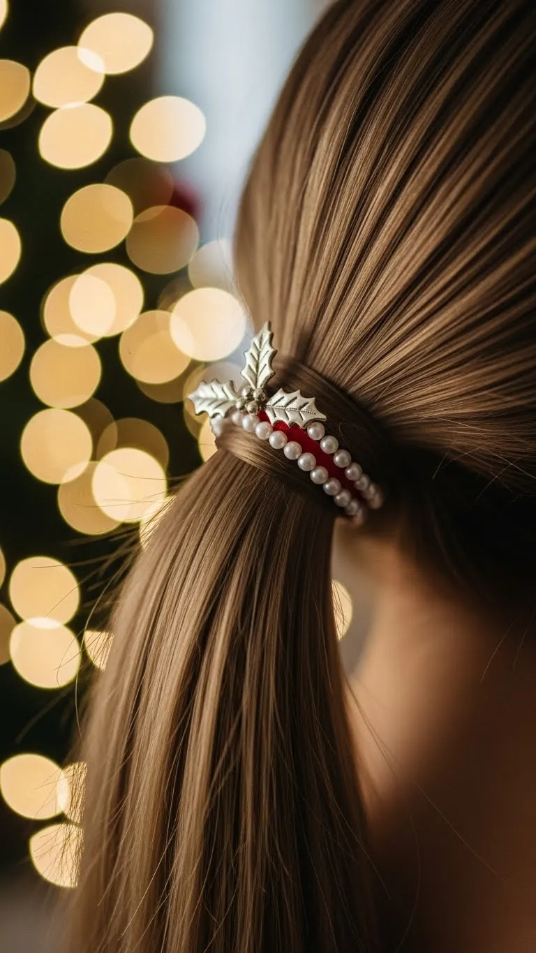 A textured ponytail is simple and pretty. Brush the hair back loosely and secure it at mid-height. Use a sparkly elastic or holiday tie. These are cheap and come in packs. Pull small pieces around the face for a soft shape. If your ponytail looks flat, gently tease the underside or scrunch it with water. This works for medium and long hair. You can wrap a thin ribbon around the elastic for extra color. It’s a comfortable style that doesn’t slip.