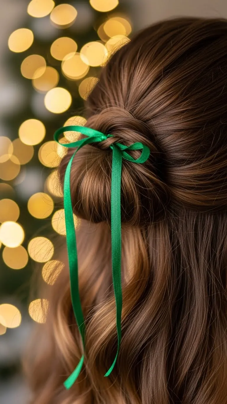 A twisted half-up style creates a gentle look that works for any Christmas Eve plan. Take two small front sections, twist them back, and secure with bobby pins. Keep the twists loose so they frame your face softly. You don’t need special tools. A simple satin ribbon or clip from a budget store works well. Smooth the ends with a bit of conditioner if the hair feels dry. This style pairs nicely with sweaters or dressy outfits. If your hair is shorter, twist smaller pieces so it stays secure. You can tuck in a small accessory for color, but keep it light so it doesn’t slip. This is an easy option when you want something pretty that takes little effort.
