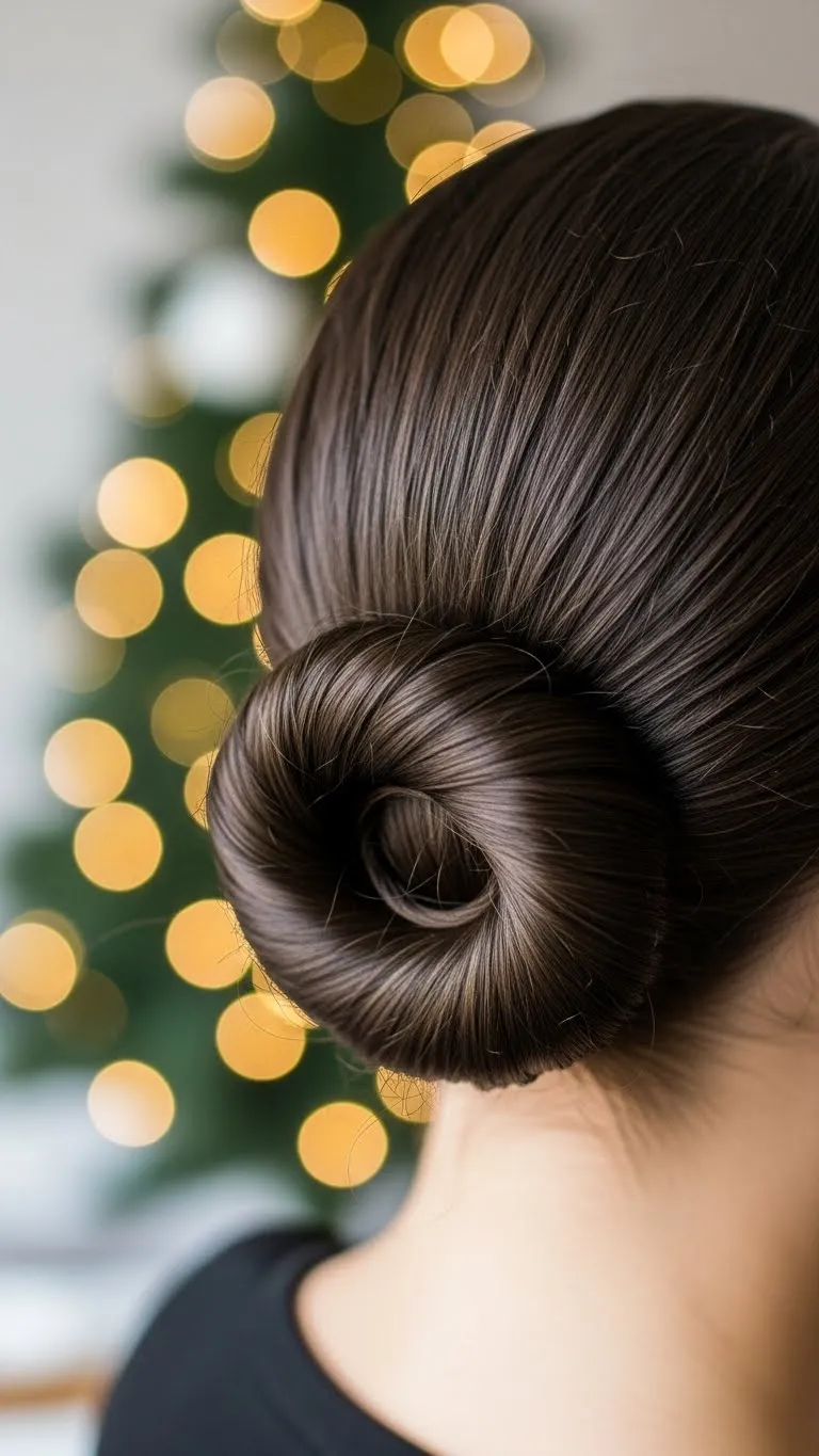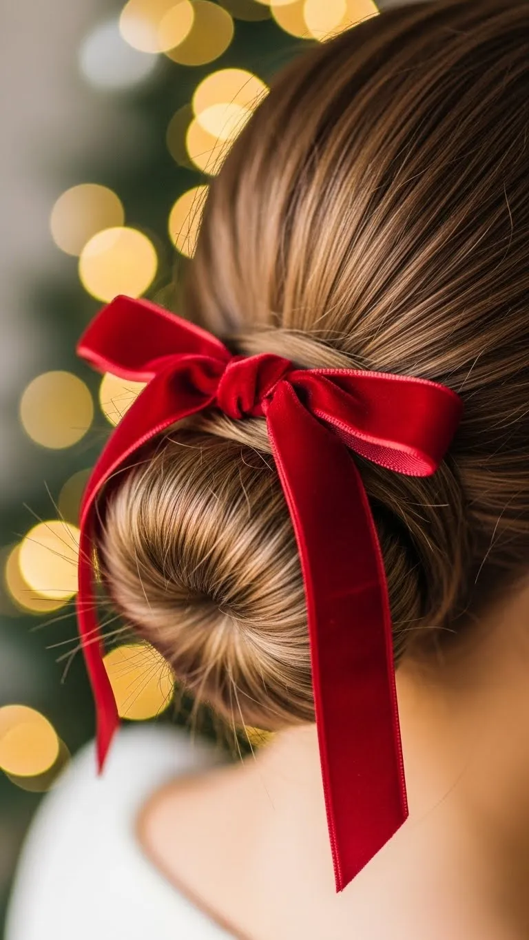 A low bun works well when you want a tidy style that still feels special. Brush the hair back gently, twist it into a loose bun, and tie a velvet ribbon around the base. You can find ribbon at craft stores for a very low price. Keep the bun soft so it feels comfortable during dinner or family gatherings. This style fits long and medium hair. If your hair is thick, use a sturdy elastic underneath. Add a light mist of water to smooth flyaways. The ribbon brings a holiday touch without being expensive. It photographs nicely too. If you want extra texture, braid the ponytail before forming the bun.