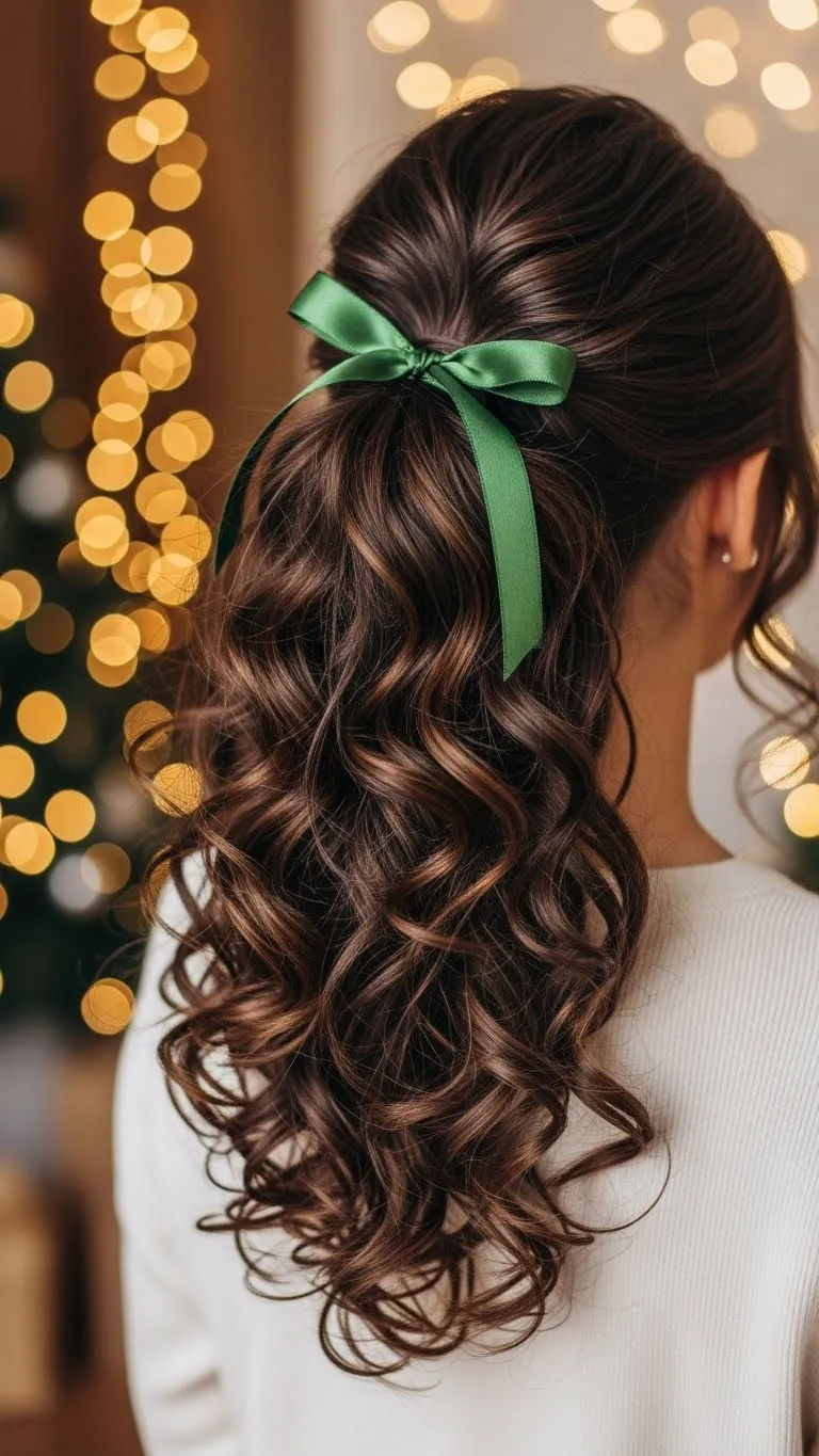 A curly ponytail works beautifully for Christmas Eve. Pull your curls back gently and tie with a satin ribbon. These ribbons are inexpensive and easy to find. Keep the curls soft by scrunching with a bit of water. If your curls are short, create a half pony instead. The ribbon adds color without feeling heavy. This style stays comfortable and is easy to refresh throughout the evening.