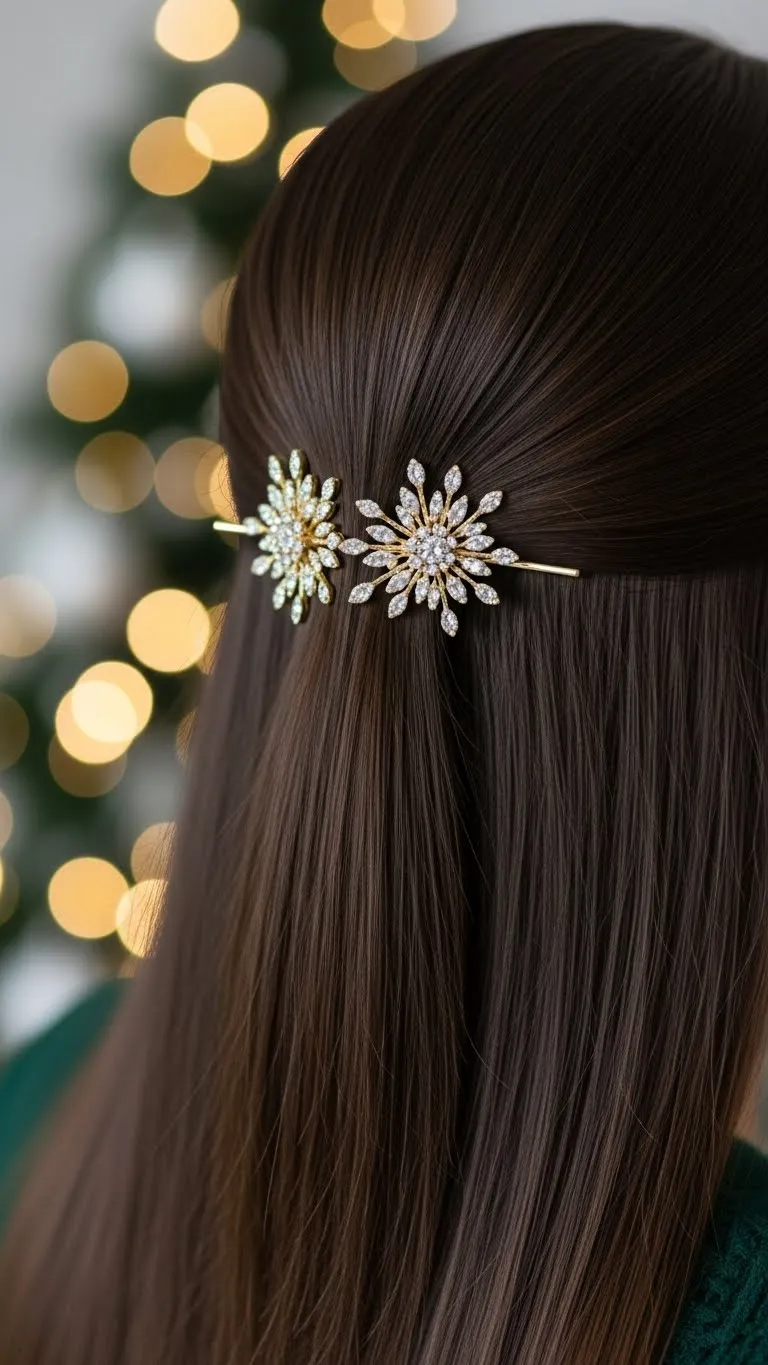 A middle part with delicate pins looks polished and simple. Brush the hair until smooth, part it neatly, and place a pin on each side. Choose small metallic or pearl pins for a clean look. They’re inexpensive and widely available. This style works for straight and wavy hair. Add a drop of conditioner to your hands if your hair feels dry. It’s a clean, easy style that fits any Christmas Eve outfit.