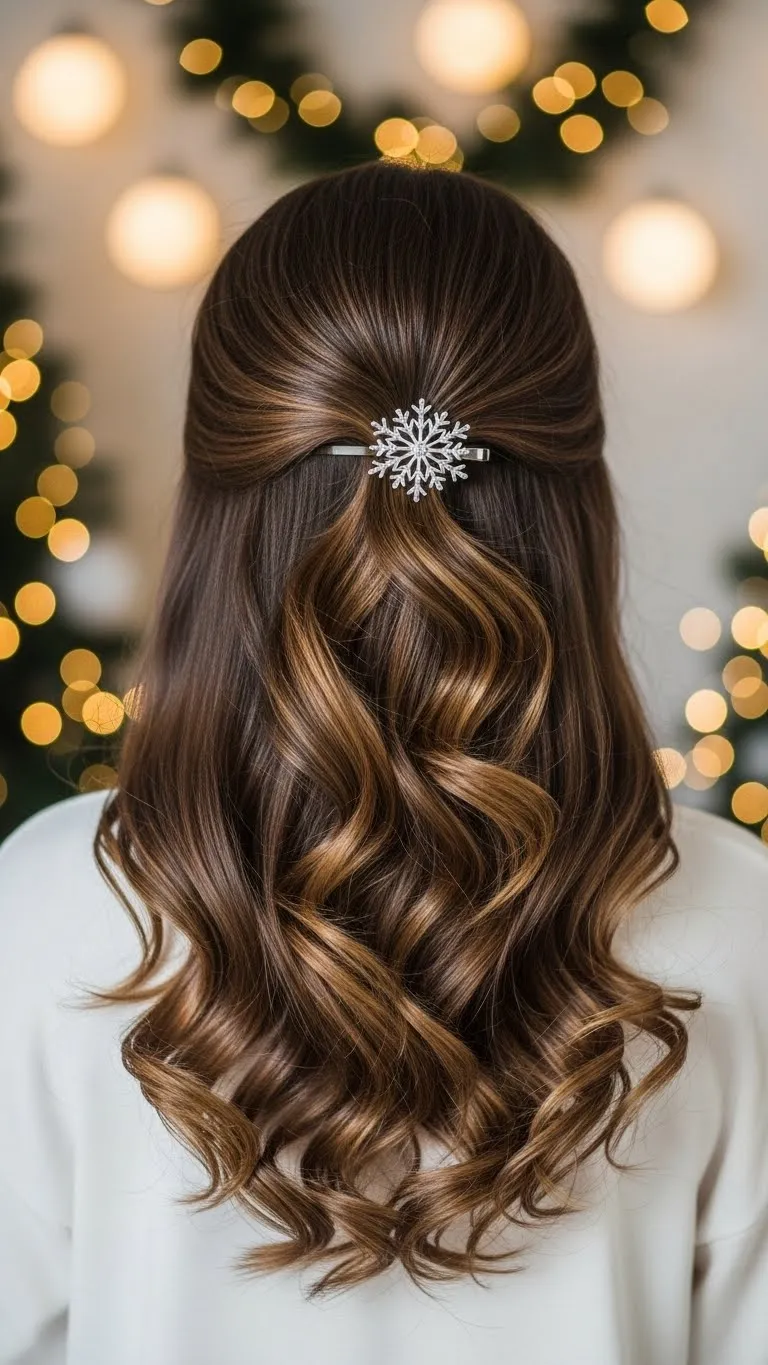 Pinning back waves keeps the hair out of your face while adding gentle style. Create waves, then pull back two small sections and secure them with pins. Use holiday-themed pins for color. These are cheap and come in sets. Keep the waves loose so the look stays relaxed. This style works for medium and long hair. You can adjust the pins anytime during the evening.
